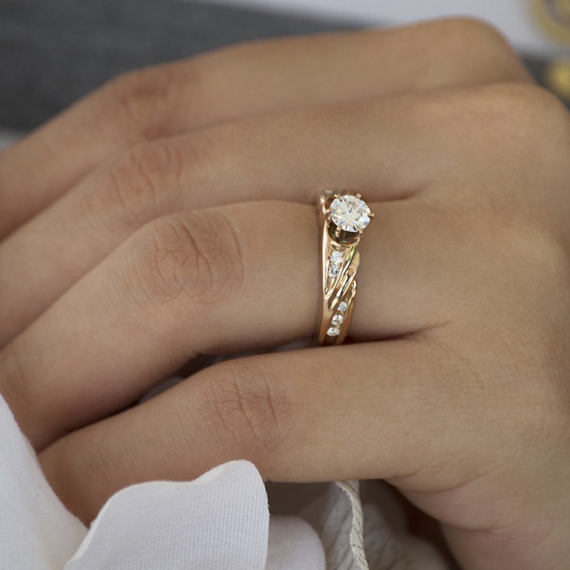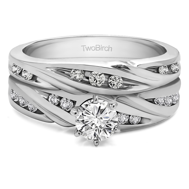 This TwoBirch bridal set features two rings: an engagement ring and matching wedding band. Every bridal set we sell is made with conflict free and eco-conscious metals and stones. This engagement ring features a Round center stone, surrounded by 10 side stones. The engagement ring has a 0.5 carat center stone, and 0.16 carats of side stones, giving the engagement ring a total weight of 0.66 carats. The matching wedding band in this set has 7 stones with a total weight of 0.15 carats. This bridal set has a total combined weight of 0.81 carats. If you would like to purchase just the engagement ring in this set, please search for TB-ENG-327-CH in the search bar above. This set is available in many variations of gold, as well as moissanite, diamonds, or even as a mounting with no center stone. Please make selections from the drop down menus.