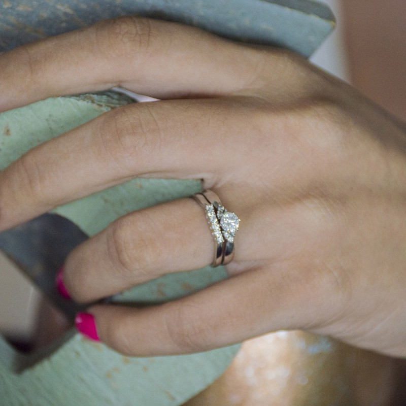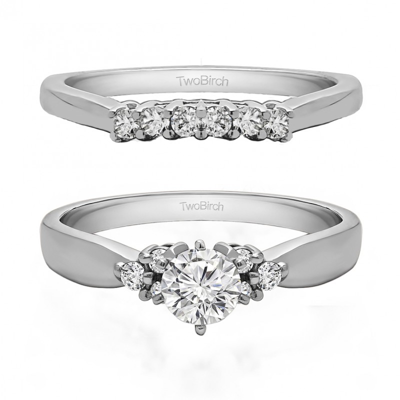 This TwoBirch bridal set features two rings: an engagement ring and matching wedding band. Every bridal set we sell is made with conflict free and eco-conscious metals and stones. This engagement ring features a Round center stone, surrounded by 6 side stones. The engagement ring has a 0.42 carat center stone, and 0.09 carats of side stones, giving the engagement ring a total weight of 0.51 carats. The matching wedding band in this set has 38 stones with a total weight of 0.12 carats. This bridal set has a total combined weight of 0.63 carats. If you would like to purchase just the engagement ring in this set, please search for TB-ENG-289-BG in the search bar above. This set is available in many variations of gold, as well as moissanite, diamonds, or even as a mounting with no center stone. Please make selections from the drop down menus.