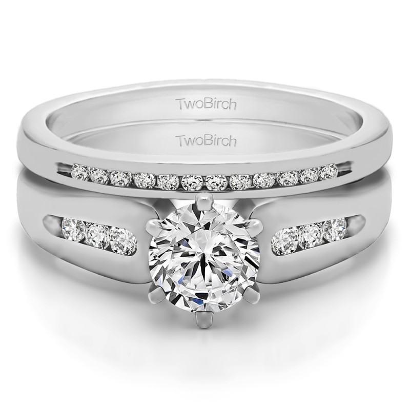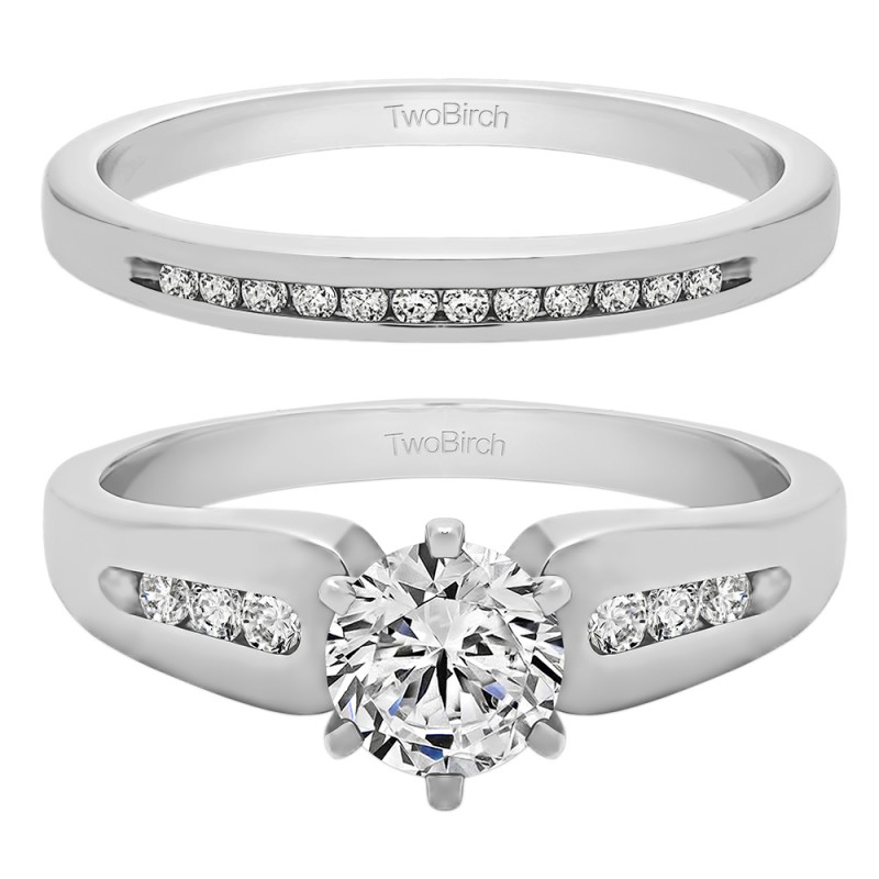 This TwoBirch bridal set features two rings: an engagement ring and matching wedding band. Every bridal set we sell is made with conflict free and eco-conscious metals and stones. This engagement ring features a Round center stone, surrounded by 6 side stones. The engagement ring has a 0.5 carat center stone, and 0.16 carats of side stones, giving the engagement ring a total weight of 0.66 carats. The matching wedding band in this set has 12 stones with a total weight of 0.09 carats. This bridal set has a total combined weight of 0.75 carats. If you would like to purchase just the engagement ring in this set, please search for TB-ENG-287-CH in the search bar above. This set is available in many variations of gold, as well as moissanite, diamonds, or even as a mounting with no center stone. Please make selections from the drop down menus.