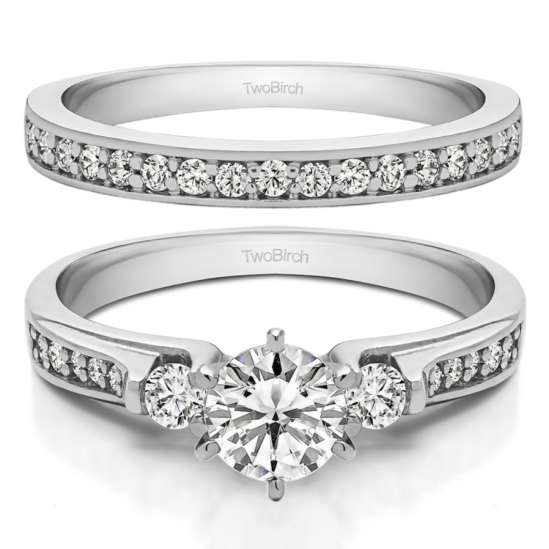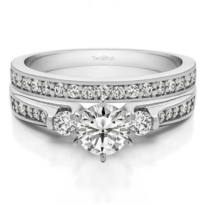 This TwoBirch bridal set features two rings: an engagement ring and matching wedding band. Every bridal set we sell is made with conflict free and eco-conscious metals and stones. This engagement ring features a Round center stone, surrounded by 12 side stones. The engagement ring has a 0.5 carat center stone, and 0.27 carats of side stones, giving the engagement ring a total weight of 0.77 carats. The matching wedding band in this set has 17 stones with a total weight of 0.2125 carats. This bridal set has a total combined weight of 0.9825 carats. If you would like to purchase just the engagement ring in this set, please search for TB-ENG-352-EH in the search bar above. This set is available in many variations of gold, as well as moissanite, diamonds, or even as a mounting with no center stone. Please make selections from the drop down menus.