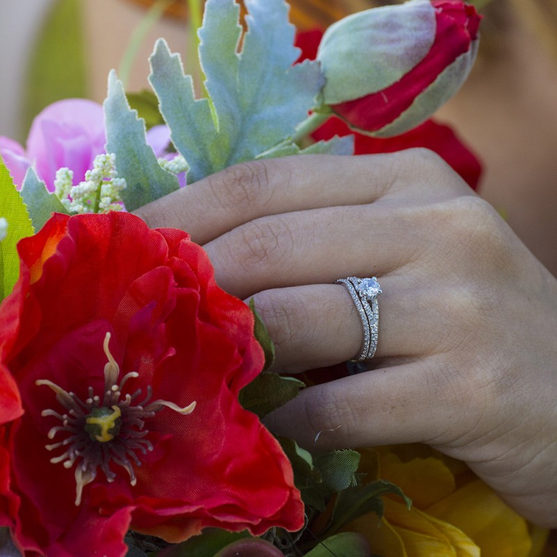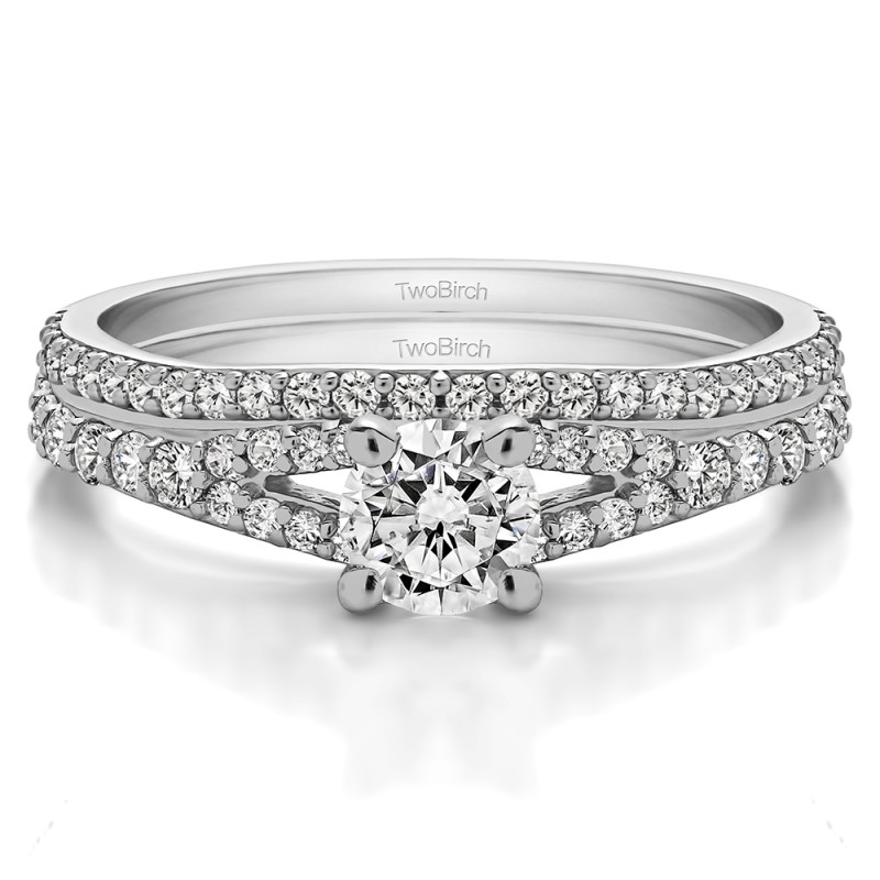 This TwoBirch bridal set features two rings: an engagement ring and matching wedding band. Every bridal set we sell is made with conflict free and eco-conscious metals and stones. This engagement ring features a Round center stone, surrounded by 28 side stones. The engagement ring has a 0.5 carat center stone, and 0.33 carats of side stones, giving the engagement ring a total weight of 0.83 carats. The matching wedding band in this set has 24 stones with a total weight of 0.18 carats. This bridal set has a total combined weight of 1.01 carats. If you would like to purchase just the engagement ring in this set, please search for TB-ENG-202-F5H in the search bar above. This set is available in many variations of gold, as well as moissanite, diamonds, or even as a mounting with no center stone. Please make selections from the drop down menus.