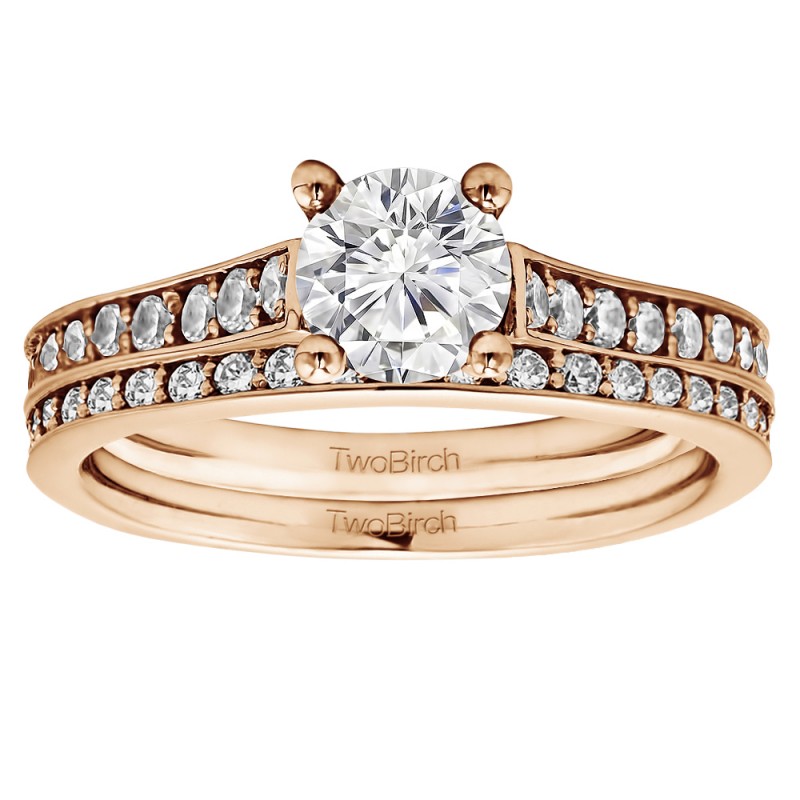 This TwoBirch bridal set features two rings: an engagement ring and matching wedding band. Every bridal set we sell is made with conflict free and eco-conscious metals and stones. This engagement ring features a Round center stone, surrounded by 24 side stones. The engagement ring has a 1 carat center stone, and 0.39 carats of side stones, giving the engagement ring a total weight of 1.39 carats. The matching wedding band in this set has 27 stones with a total weight of 0.34 carats. This bridal set has a total combined weight of 1.73 carats. If you would like to purchase just the engagement ring in this set, please search for TB-ENG-235-G8L in the search bar above. This set is available in many variations of gold, as well as moissanite, diamonds, or even as a mounting with no center stone. Please make selections from the drop down menus.