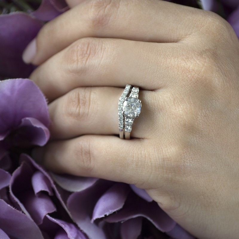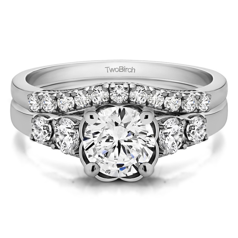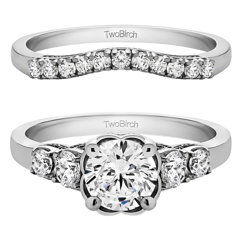 This TwoBirch bridal set features two rings: an engagement ring and matching wedding band. Every bridal set we sell is made with conflict free and eco-conscious metals and stones. This engagement ring features a Round center stone, surrounded by 4 side stones. The engagement ring has a 1 carat center stone, and 0.49 carats of side stones, giving the engagement ring a total weight of 1.49 carats. The matching wedding band in this set has 11 stones with a total weight of 0.22 carats. This bridal set has a total combined weight of 1.71 carats. If you would like to purchase just the engagement ring in this set, please search for TB-ENG-246-H8L in the search bar above. This set is available in many variations of gold, as well as moissanite, diamonds, or even as a mounting with no center stone. Please make selections from the drop down menus.