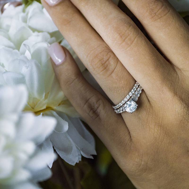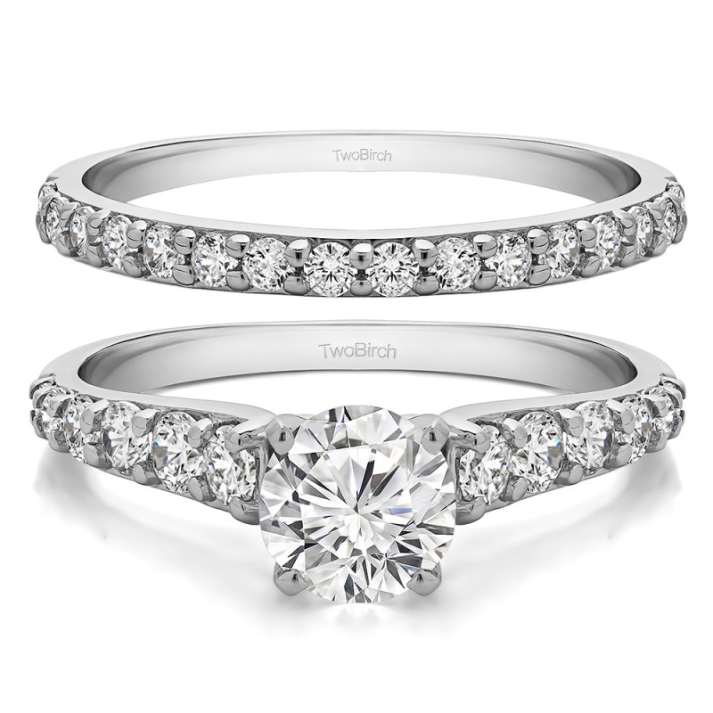 This TwoBirch bridal set features two rings: an engagement ring and matching wedding band. Every bridal set we sell is made with conflict free and eco-conscious metals and stones. This engagement ring features a Round center stone, surrounded by 12 side stones. The engagement ring has a 1 carat center stone, and 0.7 carats of side stones, giving the engagement ring a total weight of 1.7 carats. The matching wedding band in this set has 16 stones with a total weight of 0.32 carats. This bridal set has a total combined weight of 2.02 carats. If you would like to purchase just the engagement ring in this set, please search for TB-ENG-221-JL in the search bar above. This set is available in many variations of gold, as well as moissanite, diamonds, or even as a mounting with no center stone. Please make selections from the drop down menus.