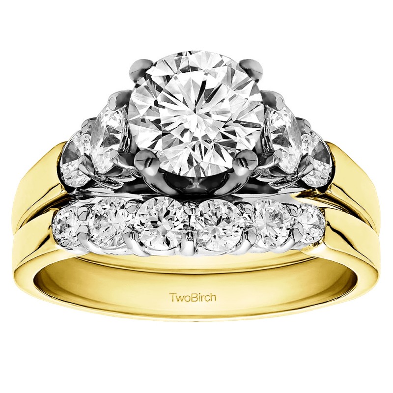 This TwoBirch bridal set features two rings: an engagement ring and matching wedding band. Every bridal set we sell is made with conflict free and eco-conscious metals and stones. This engagement ring features a Round center stone, surrounded by 4 side stones. The engagement ring has a 1 carat center stone, and 0.74 carats of side stones, giving the engagement ring a total weight of 1.74 carats. The matching wedding band in this set has 6 stones with a total weight of 0.42 carats. This bridal set has a total combined weight of 2.16 carats. If you would like to purchase just the engagement ring in this set, please search for TB-ENG-270-J8L in the search bar above. This set is available in many variations of gold, as well as moissanite, diamonds, or even as a mounting with no center stone. Please make selections from the drop down menus.