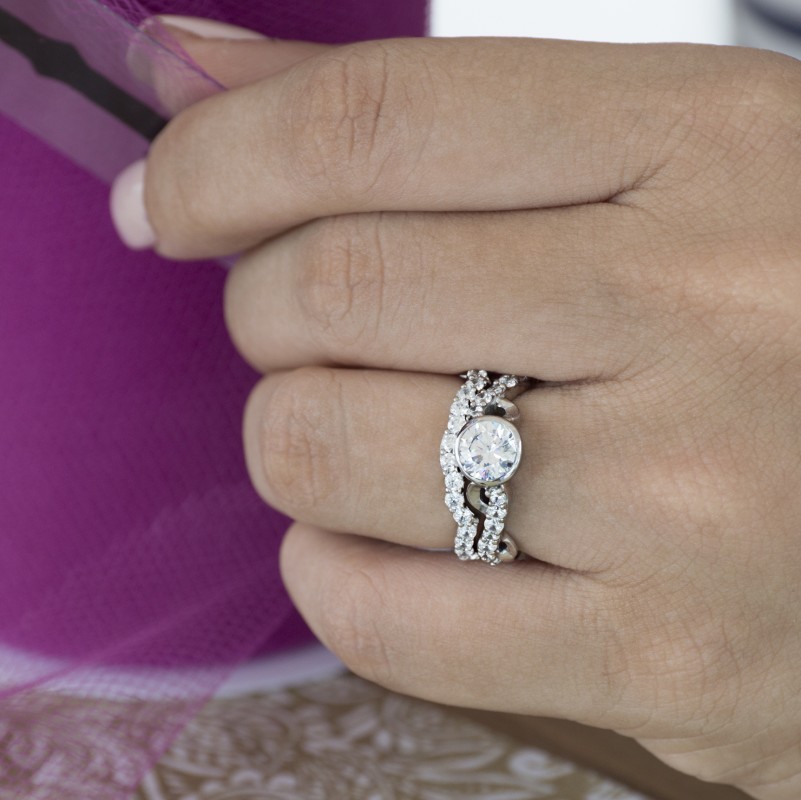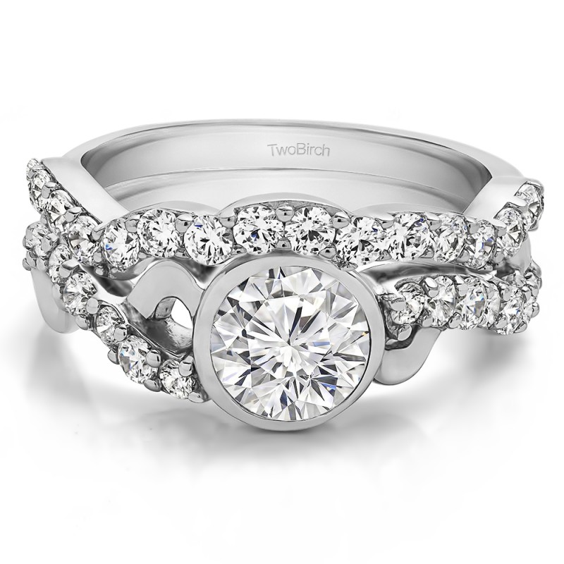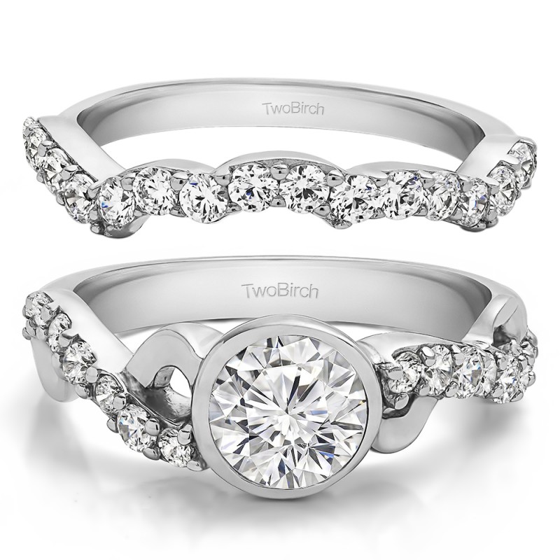 This TwoBirch bridal set features two rings: an engagement ring and matching wedding band. Every bridal set we sell is made with conflict free and eco-conscious metals and stones. This engagement ring features a Round center stone, surrounded by 14 side stones. The engagement ring has a 1 carat center stone, and 0.41 carats of side stones, giving the engagement ring a total weight of 1.41 carats. The matching wedding band in this set has 16 stones with a total weight of 0.48 carats. This bridal set has a total combined weight of 1.89 carats. If you would like to purchase just the engagement ring in this set, please search for TB-ENG-259-G8L in the search bar above. This set is available in many variations of gold, as well as moissanite, diamonds, or even as a mounting with no center stone. Please make selections from the drop down menus.