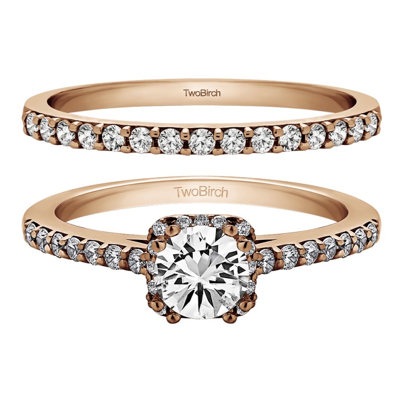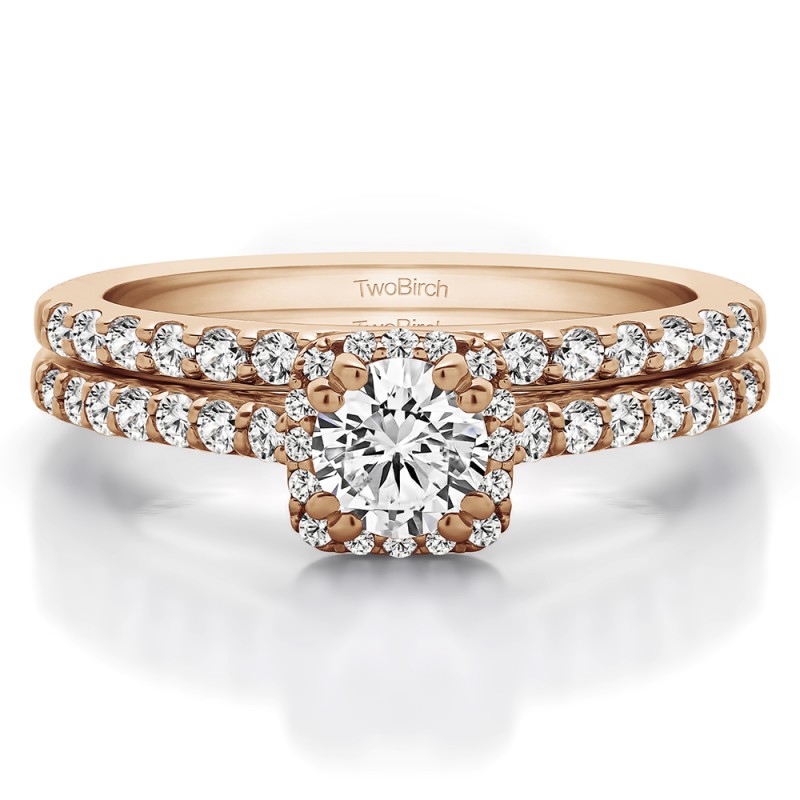 This TwoBirch bridal set features two rings: an engagement ring and matching wedding band. Every bridal set we sell is made with conflict free and eco-conscious metals and stones. This engagement ring features a Round center stone, surrounded by 30 side stones. The engagement ring has a 0.5 carat center stone, and 0.29 carats of side stones, giving the engagement ring a total weight of 0.79 carats. The matching wedding band in this set has 15 stones with a total weight of 0.23 carats. This bridal set has a total combined weight of 1.02 carats. If you would like to purchase just the engagement ring in this set, please search for TB-ENG-225-F5H in the search bar above. This set is available in many variations of gold, as well as moissanite, diamonds, or even as a mounting with no center stone. Please make selections from the drop down menus.