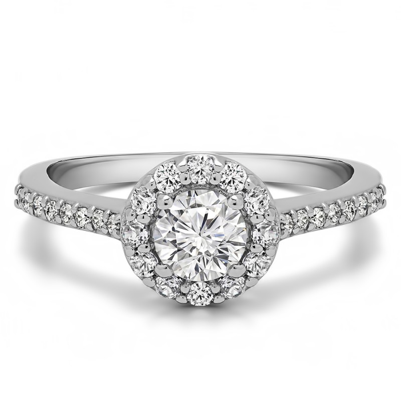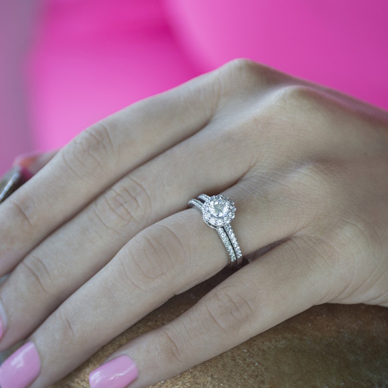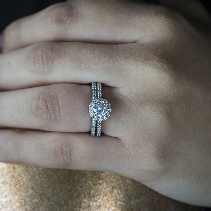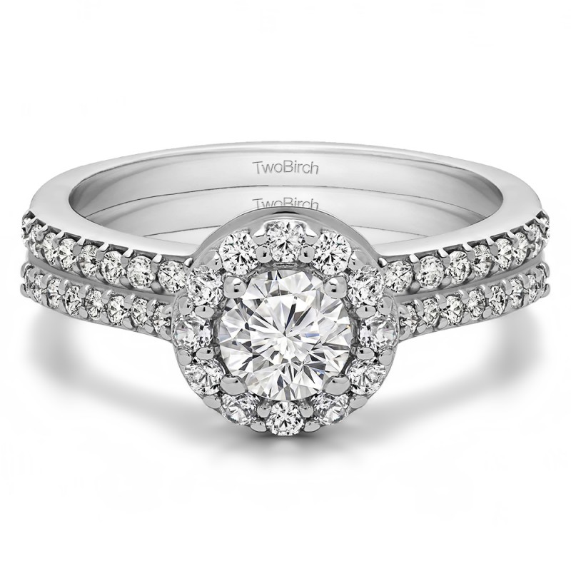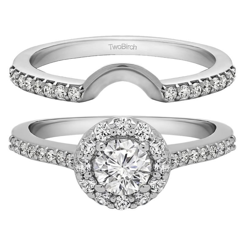 This TwoBirch bridal set features two rings: an engagement ring and matching wedding band. Every bridal set we sell is made with conflict free and eco-conscious metals and stones. This engagement ring features a Round center stone, surrounded by 28 side stones. The engagement ring has a 0.5 carat center stone, and 0.42 carats of side stones, giving the engagement ring a total weight of 0.92 carats. The matching wedding band in this set has 16 stones with a total weight of 0.16 carats. This bridal set has a total combined weight of 1.08 carats. If you would like to purchase just the engagement ring in this set, please search for TB-ENG-204-G5H in the search bar above. This set is available in many variations of gold, as well as moissanite, diamonds, or even as a mounting with no center stone. Please make selections from the drop down menus.