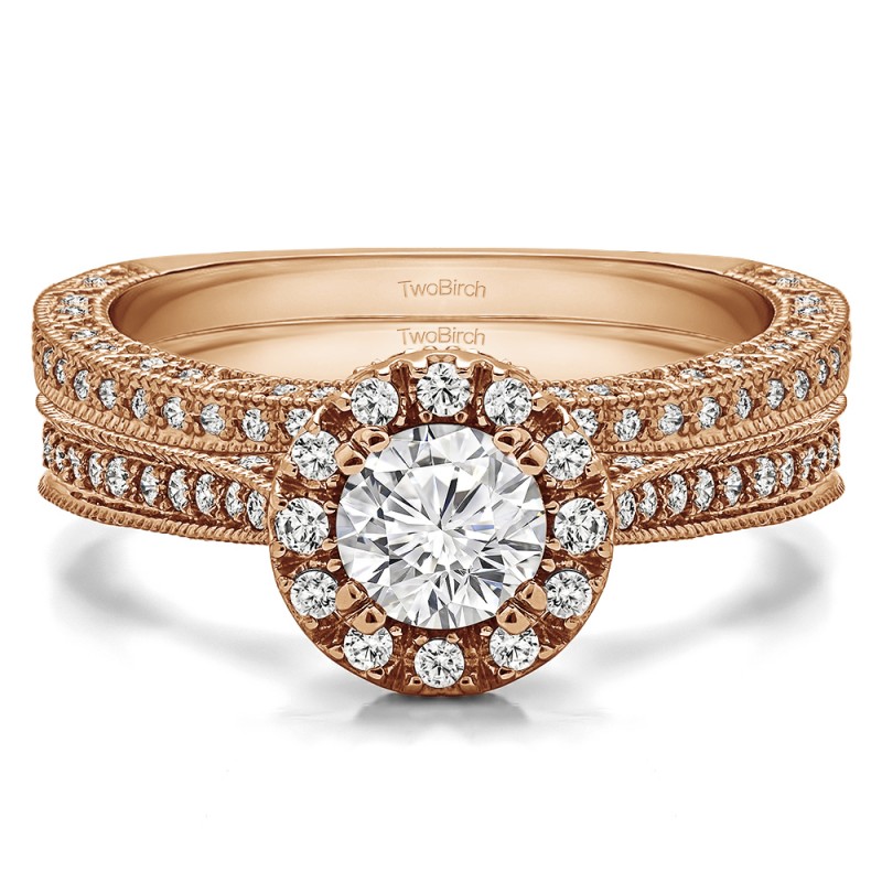 This TwoBirch bridal set features two rings: an engagement ring and matching wedding band. Every bridal set we sell is made with conflict free and eco-conscious metals and stones. This engagement ring features a Round center stone, surrounded by 96 side stones. The engagement ring has a 0.5 carat center stone, and 0.52 carats of side stones, giving the engagement ring a total weight of 1.02 carats. The matching wedding band in this set has 74 stones with a total weight of 0.3 carats. This bridal set has a total combined weight of 1.32 carats. If you would like to purchase just the engagement ring in this set, please search for TB-ENG-213-H5H in the search bar above. This set is available in many variations of gold, as well as moissanite, diamonds, or even as a mounting with no center stone. Please make selections from the drop down menus.
