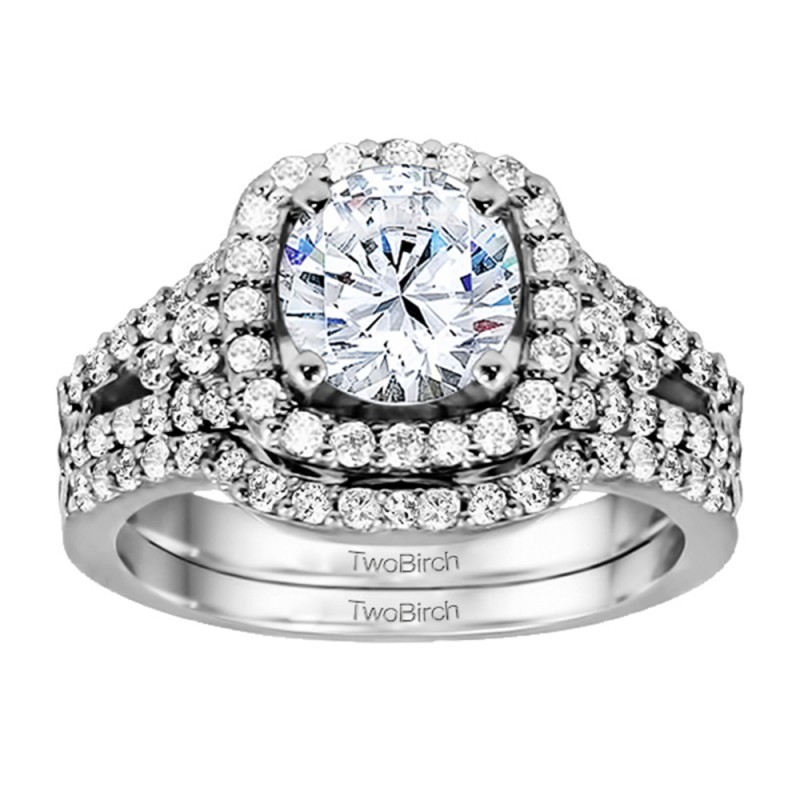 This TwoBirch bridal set features two rings: an engagement ring and matching wedding band. Every bridal set we sell is made with conflict free and eco-conscious metals and stones. This engagement ring features a Round center stone, surrounded by 46 side stones. The engagement ring has a 0.5 carat center stone, and 0.68 carats of side stones, giving the engagement ring a total weight of 1.18 carats. The matching wedding band in this set has 19 stones with a total weight of 0.29 carats. This bridal set has a total combined weight of 1.47 carats. If you would like to purchase just the engagement ring in this set, please search for TB-ENG-201-J5H in the search bar above. This set is available in many variations of gold, as well as moissanite, diamonds, or even as a mounting with no center stone. Please make selections from the drop down menus.