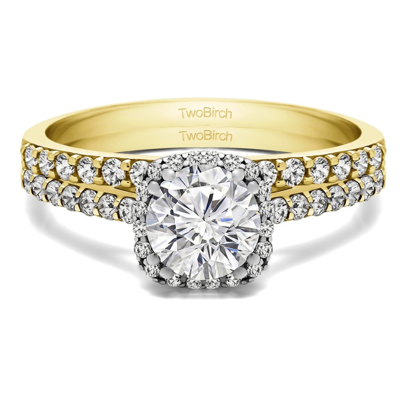 This TwoBirch bridal set features two rings: an engagement ring and matching wedding band. Every bridal set we sell is made with conflict free and eco-conscious metals and stones. This engagement ring features a Round center stone, surrounded by 34 side stones. The engagement ring has a 1 carat center stone, and 0.31 carats of side stones, giving the engagement ring a total weight of 1.31 carats. The matching wedding band in this set has 15 stones with a total weight of 0.23 carats. This bridal set has a total combined weight of 1.54 carats. If you would like to purchase just the engagement ring in this set, please search for TB-ENG-369-F8L in the search bar above. This set is available in many variations of gold, as well as moissanite, diamonds, or even as a mounting with no center stone. Please make selections from the drop down menus.