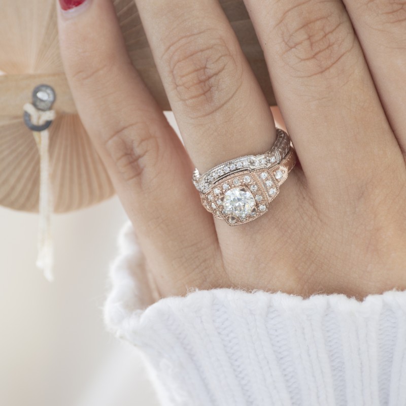 This TwoBirch bridal set features two rings: an engagement ring and matching wedding band. Every bridal set we sell is made with conflict free and eco-conscious metals and stones. This engagement ring features a Round center stone, surrounded by 20 side stones. The engagement ring has a 1 carat center stone, and 0.35 carats of side stones, giving the engagement ring a total weight of 1.35 carats. The matching wedding band in this set has 13 stones with a total weight of 0.1 carats. This bridal set has a total combined weight of 1.45 carats. If you would like to purchase just the engagement ring in this set, please search for TB-ENG-218-F8L in the search bar above. This set is available in many variations of gold, as well as moissanite, diamonds, or even as a mounting with no center stone. Please make selections from the drop down menus.