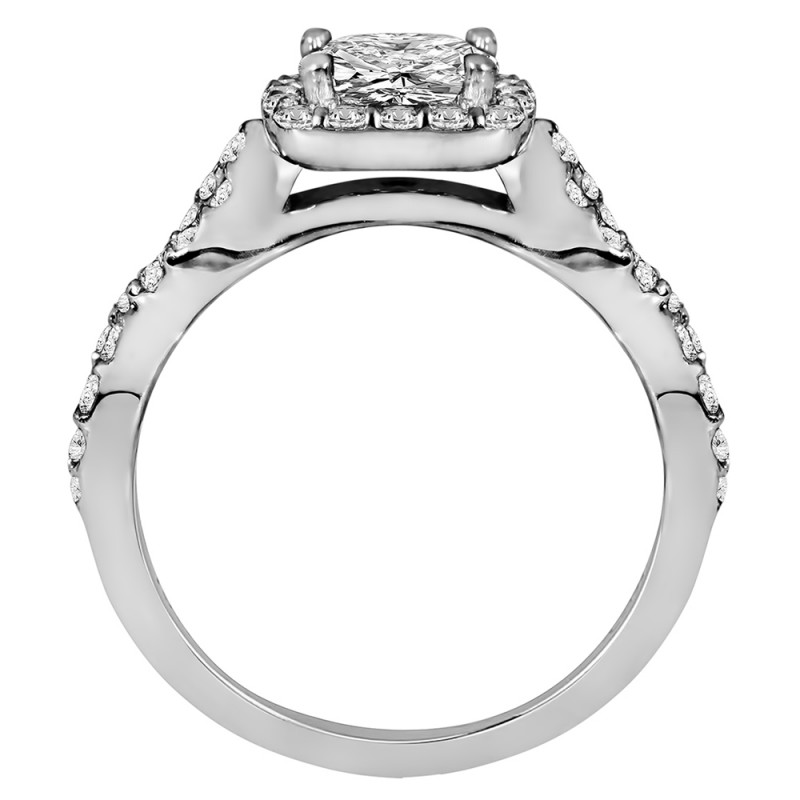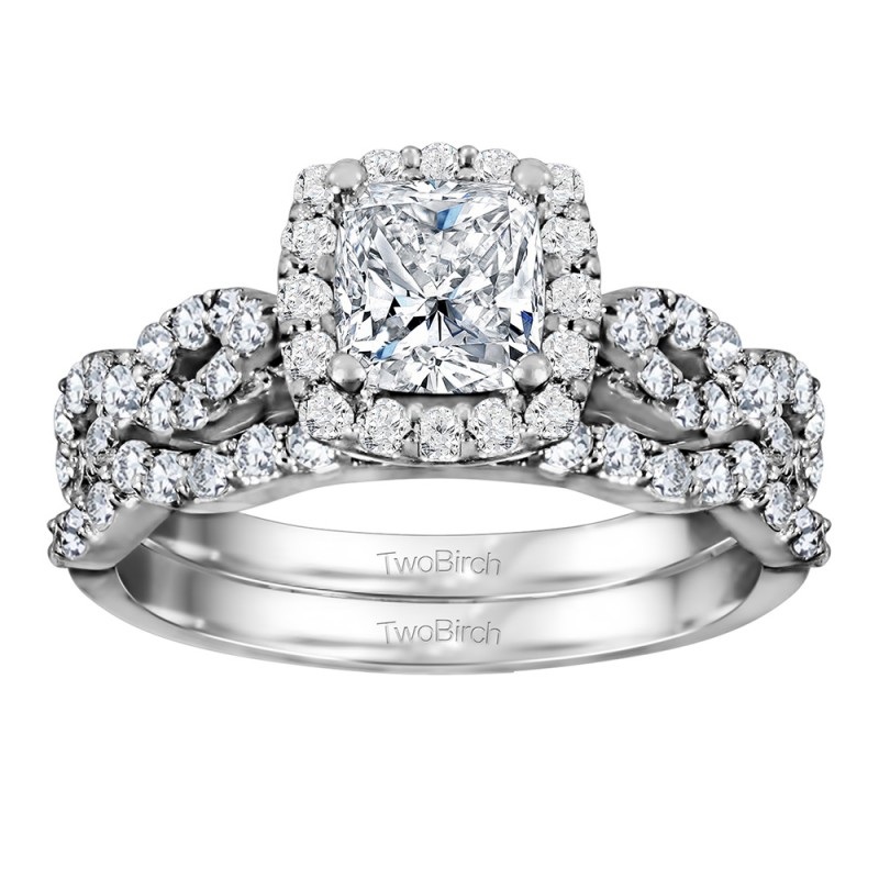 This TwoBirch bridal set features two rings: an engagement ring and matching wedding band. Every bridal set we sell is made with conflict free and eco-conscious metals and stones. This engagement ring features a Cushion center stone, surrounded by 46 side stones. The engagement ring has a 1 carat center stone, and 0.69 carats of side stones, giving the engagement ring a total weight of 1.69 carats. The matching wedding band in this set has 27 stones with a total weight of 0.315 carats. This bridal set has a total combined weight of 2.005 carats. If you would like to purchase just the engagement ring in this set, please search for TB-ENG-280-J8L in the search bar above. This set is available in many variations of gold, as well as moissanite, diamonds, or even as a mounting with no center stone. Please make selections from the drop down menus.