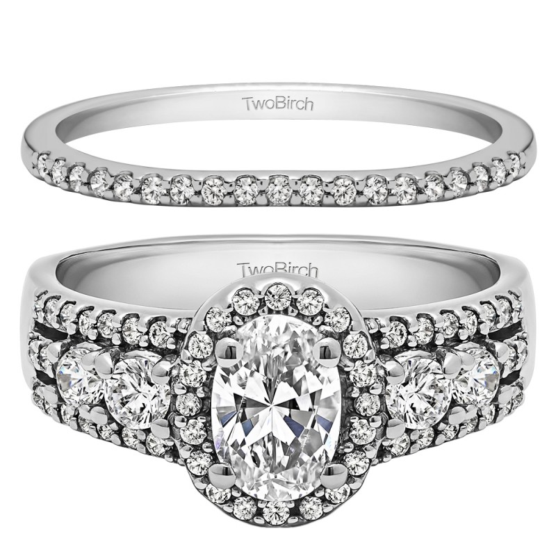 This TwoBirch bridal set features two rings: an engagement ring and matching wedding band. Every bridal set we sell is made with conflict free and eco-conscious metals and stones. This engagement ring features a Oval center stone, surrounded by 58 side stones. The engagement ring has a 1 carat center stone, and 0.73 carats of side stones, giving the engagement ring a total weight of 1.73 carats. The matching wedding band in this set has 27 stones with a total weight of 0.095 carats. This bridal set has a total combined weight of 1.825 carats. If you would like to purchase just the engagement ring in this set, please search for TB-ENG-279-J8L in the search bar above. This set is available in many variations of gold, as well as moissanite, diamonds, or even as a mounting with no center stone. Please make selections from the drop down menus.