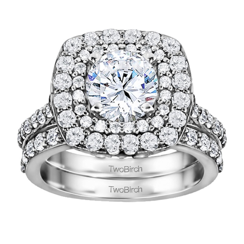 This TwoBirch bridal set features two rings: an engagement ring and matching wedding band. Every bridal set we sell is made with conflict free and eco-conscious metals and stones. This engagement ring features a Round center stone, surrounded by 52 side stones. The engagement ring has a 0.5 carat center stone, and 0.5 carats of side stones, giving the engagement ring a total weight of 1 carats. The matching wedding band in this set has 16 stones with a total weight of 0.16 carats. This bridal set has a total combined weight of 1.16 carats. If you would like to purchase just the engagement ring in this set, please search for TB-ENG-203-H5H in the search bar above. This set is available in many variations of gold, as well as moissanite, diamonds, or even as a mounting with no center stone. Please make selections from the drop down menus.
