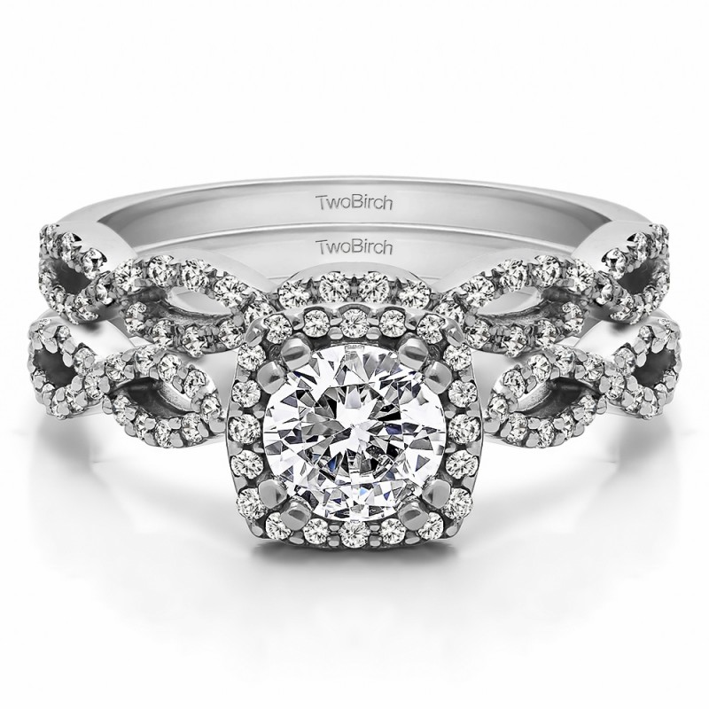 This TwoBirch bridal set features two rings: an engagement ring and matching wedding band. Every bridal set we sell is made with conflict free and eco-conscious metals and stones. This engagement ring features a Round center stone, surrounded by 58 side stones. The engagement ring has a 0.75 carat center stone, and 0.25 carats of side stones, giving the engagement ring a total weight of 1 carats. The matching wedding band in this set has 46 stones with a total weight of 0.18 carats. This bridal set has a total combined weight of 1.18 carats. If you would like to purchase just the engagement ring in this set, please search for TB-ENG-226-E7J in the search bar above. This set is available in many variations of gold, as well as moissanite, diamonds, or even as a mounting with no center stone. Please make selections from the drop down menus.