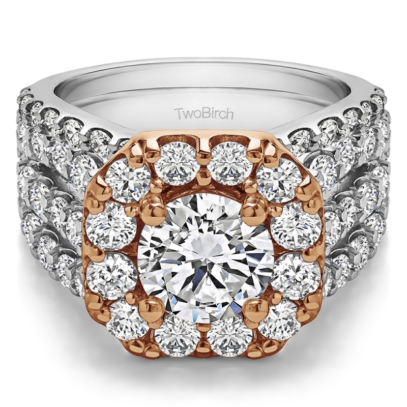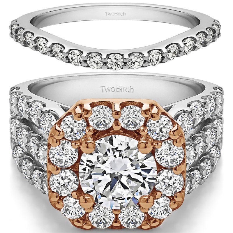 This TwoBirch bridal set features two rings: an engagement ring and matching wedding band. Every bridal set we sell is made with conflict free and eco-conscious metals and stones. This engagement ring features a Round center stone, surrounded by 42 side stones. The engagement ring has a 2 carat center stone, and 2.19 carats of side stones, giving the engagement ring a total weight of 4.19 carats. The matching wedding band in this set has 17 stones with a total weight of 0.3 carats. This bridal set has a total combined weight of 4.49 carats. If you would like to purchase just the engagement ring in this set, please search for TB-ENG-264-QP in the search bar above. This set is available in many variations of gold, as well as moissanite, diamonds, or even as a mounting with no center stone. Please make selections from the drop down menus.