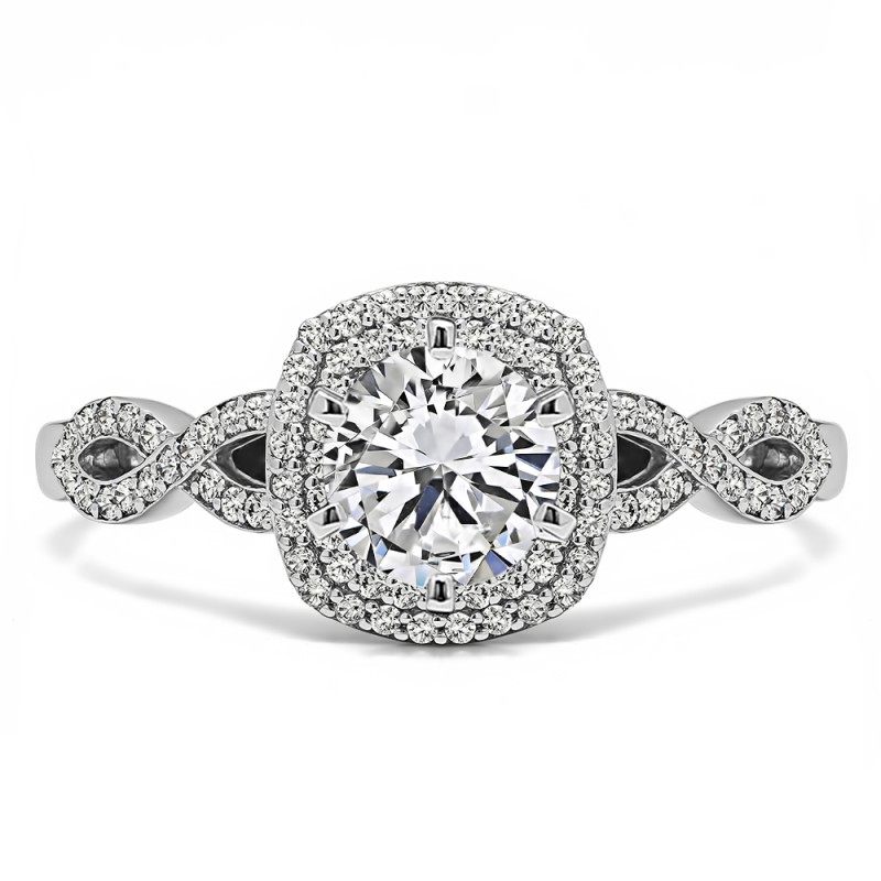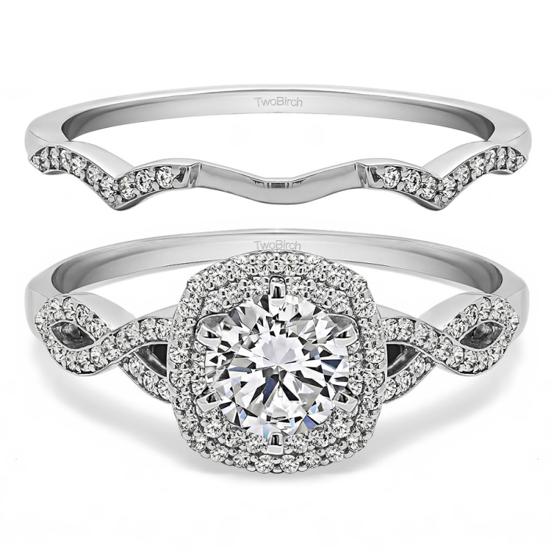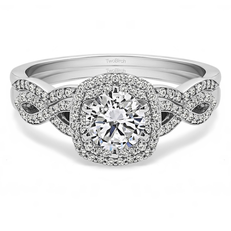 This TwoBirch bridal set features two rings: an engagement ring and matching wedding band. Every bridal set we sell is made with conflict free and eco-conscious metals and stones. This engagement ring features a Round center stone, surrounded by 90 side stones. The engagement ring has a 0.75 carat center stone, and 0.53 carats of side stones, giving the engagement ring a total weight of 1.28 carats. The matching wedding band in this set has 25 stones with a total weight of 0.09 carats. This bridal set has a total combined weight of 1.37 carats. If you would like to purchase just the engagement ring in this set, please search for TB-ENG-219-HJ in the search bar above. This set is available in many variations of gold, as well as moissanite, diamonds, or even as a mounting with no center stone. Please make selections from the drop down menus.