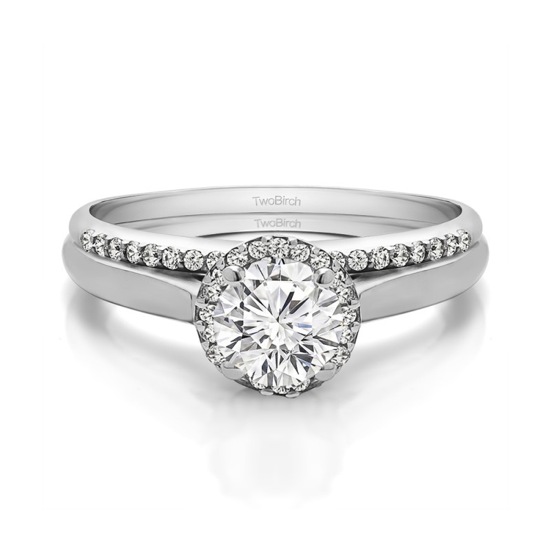 This TwoBirch bridal set features two rings: an engagement ring and matching wedding band. Every bridal set we sell is made with conflict free and eco-conscious metals and stones. This engagement ring features a Round center stone, surrounded by 20 side stones. The engagement ring has a 0.65 carat center stone, and 0.1 carats of side stones, giving the engagement ring a total weight of 0.75 carats. The matching wedding band in this set has 20 stones with a total weight of 0.1 carats. This bridal set has a total combined weight of 0.85 carats. If you would like to purchase just the engagement ring in this set, please search for TB-ENG-398-B6I in the search bar above. This set is available in many variations of gold, as well as moissanite, diamonds, or even as a mounting with no center stone. Please make selections from the drop down menus.