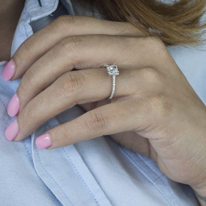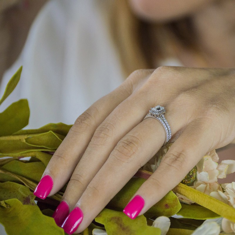 This TwoBirch bridal set features two rings: an engagement ring and matching wedding band. Every bridal set we sell is made with conflict free and eco-conscious metals and stones. This engagement ring features a Princess center stone, surrounded by 40 side stones. The engagement ring has a 0.5 carat center stone, and 0.26 carats of side stones, giving the engagement ring a total weight of 0.76 carats. The matching wedding band in this set has 12 stones with a total weight of 0.25 carats. This bridal set has a total combined weight of 1.01 carats. If you would like to purchase just the engagement ring in this set, please search for TB-ENG-273-E5H in the search bar above. This set is available in many variations of gold, as well as moissanite, diamonds, or even as a mounting with no center stone. Please make selections from the drop down menus.