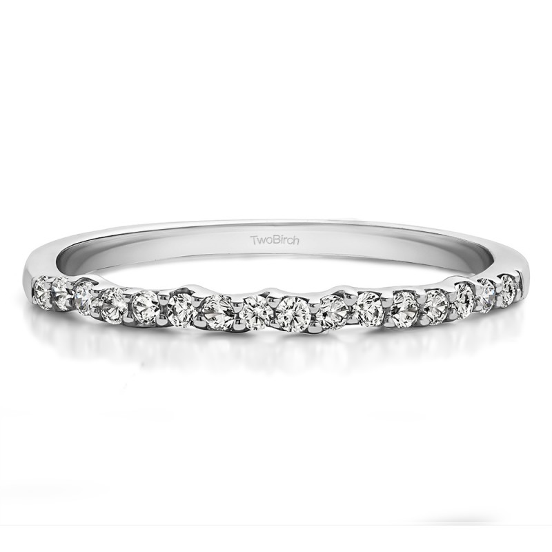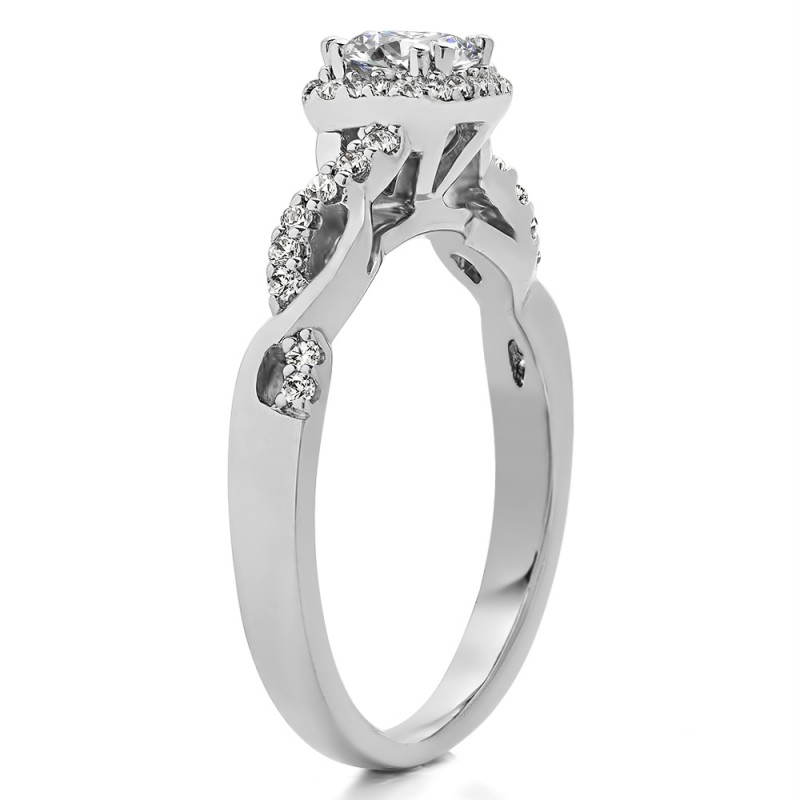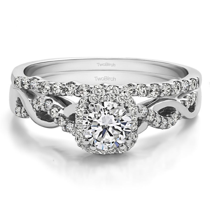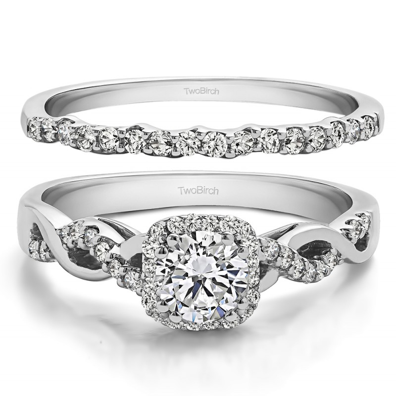 This TwoBirch bridal set features two rings: an engagement ring and matching wedding band. Every bridal set we sell is made with conflict free and eco-conscious metals and stones. This engagement ring features a Round center stone, surrounded by 36 side stones. The engagement ring has a 0.4 carat center stone, and 0.2 carats of side stones, giving the engagement ring a total weight of 0.6 carats. The matching wedding band in this set has 16 stones with a total weight of 0.16 carats. This bridal set has a total combined weight of 0.76 carats. If you would like to purchase just the engagement ring in this set, please search for TB-ENG-231-D4G in the search bar above. This set is available in many variations of gold, as well as moissanite, diamonds, or even as a mounting with no center stone. Please make selections from the drop down menus.