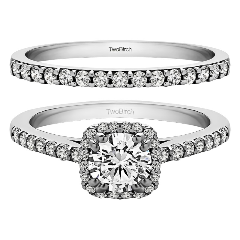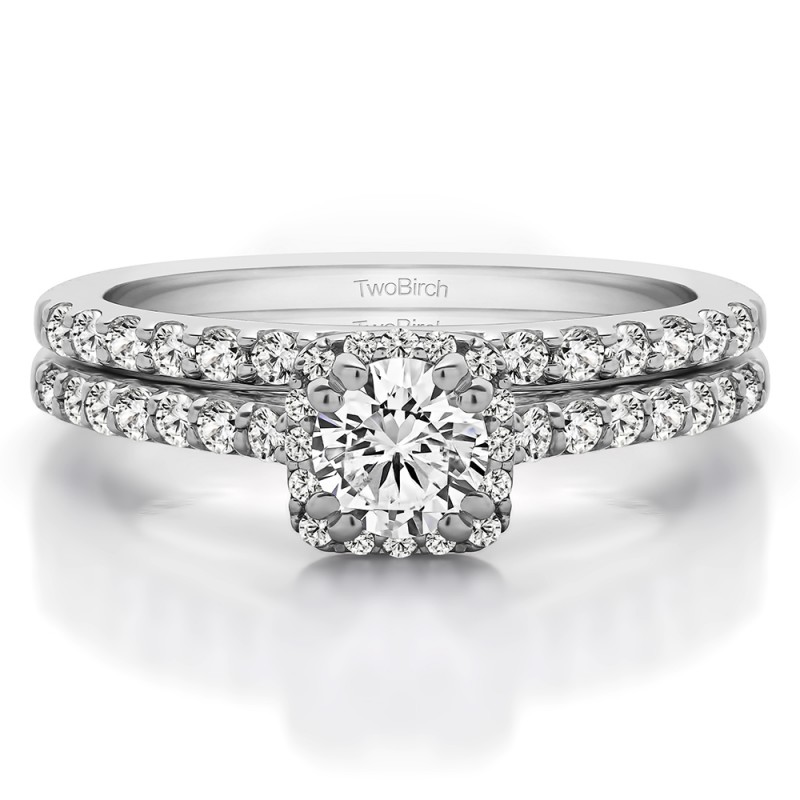 This TwoBirch bridal set features two rings: an engagement ring and matching wedding band. Every bridal set we sell is made with conflict free and eco-conscious metals and stones. This engagement ring features a Round center stone, surrounded by 30 side stones. The engagement ring has a 0.5 carat center stone, and 0.29 carats of side stones, giving the engagement ring a total weight of 0.79 carats. The matching wedding band in this set has 15 stones with a total weight of 0.23 carats. This bridal set has a total combined weight of 1.02 carats. If you would like to purchase just the engagement ring in this set, please search for TB-ENG-225-F5H in the search bar above. This set is available in many variations of gold, as well as moissanite, diamonds, or even as a mounting with no center stone. Please make selections from the drop down menus.