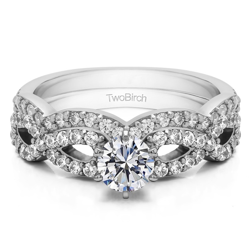 This TwoBirch bridal set features two rings: an engagement ring and matching wedding band. Every bridal set we sell is made with conflict free and eco-conscious metals and stones. This engagement ring features a Round center stone, surrounded by 54 side stones. The engagement ring has a 0.5 carat center stone, and 0.54 carats of side stones, giving the engagement ring a total weight of 1.04 carats. The matching wedding band in this set has 27 stones with a total weight of 0.225 carats. This bridal set has a total combined weight of 1.265 carats. If you would like to purchase just the engagement ring in this set, please search for TB-ENG-237-HH in the search bar above. This set is available in many variations of gold, as well as moissanite, diamonds, or even as a mounting with no center stone. Please make selections from the drop down menus.