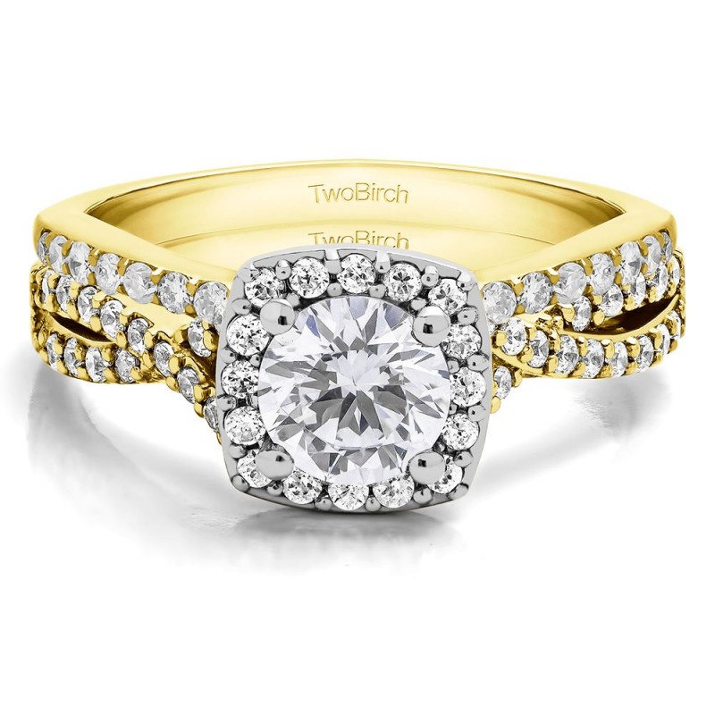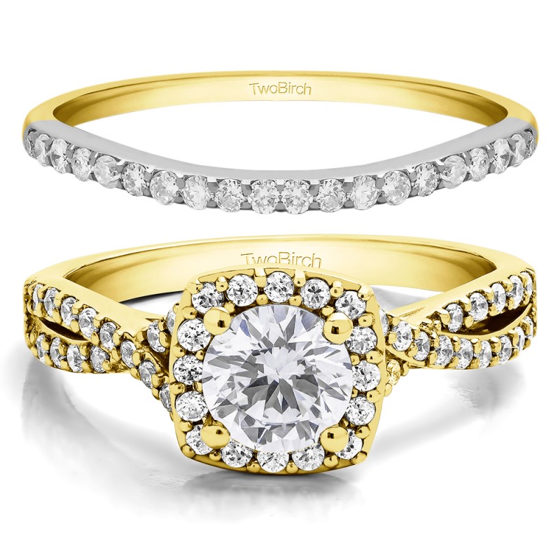 This TwoBirch bridal set features two rings: an engagement ring and matching wedding band. Every bridal set we sell is made with conflict free and eco-conscious metals and stones. This engagement ring features a Round center stone, surrounded by 48 side stones. The engagement ring has a 0.75 carat center stone, and 0.5 carats of side stones, giving the engagement ring a total weight of 1.25 carats. The matching wedding band in this set has 21 stones with a total weight of 0.21 carats. This bridal set has a total combined weight of 1.46 carats. If you would like to purchase just the engagement ring in this set, please search for TB-ENG-257-H7J in the search bar above. This set is available in many variations of gold, as well as moissanite, diamonds, or even as a mounting with no center stone. Please make selections from the drop down menus.