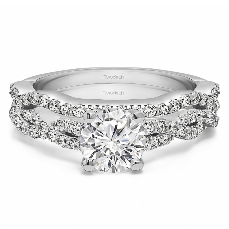 This TwoBirch bridal set features two rings: an engagement ring and matching wedding band. Every bridal set we sell is made with conflict free and eco-conscious metals and stones. This engagement ring features a Round center stone, surrounded by 46 side stones. The engagement ring has a 1 carat center stone, and 0.46 carats of side stones, giving the engagement ring a total weight of 1.46 carats. The matching wedding band in this set has 29 stones with a total weight of 0.29 carats. This bridal set has a total combined weight of 1.75 carats. If you would like to purchase just the engagement ring in this set, please search for TB-ENG-260-H8L in the search bar above. This set is available in many variations of gold, as well as moissanite, diamonds, or even as a mounting with no center stone. Please make selections from the drop down menus.