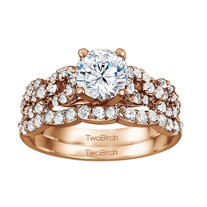 This TwoBirch bridal set features two rings: an engagement ring and matching wedding band. Every bridal set we sell is made with conflict free and eco-conscious metals and stones. This engagement ring features a Round center stone, surrounded by 34 side stones. The engagement ring has a 1 carat center stone, and 0.51 carats of side stones, giving the engagement ring a total weight of 1.51 carats. The matching wedding band in this set has 17 stones with a total weight of 0.26 carats. This bridal set has a total combined weight of 1.77 carats. If you would like to purchase just the engagement ring in this set, please search for TB-ENG-262-H8L in the search bar above. This set is available in many variations of gold, as well as moissanite, diamonds, or even as a mounting with no center stone. Please make selections from the drop down menus.