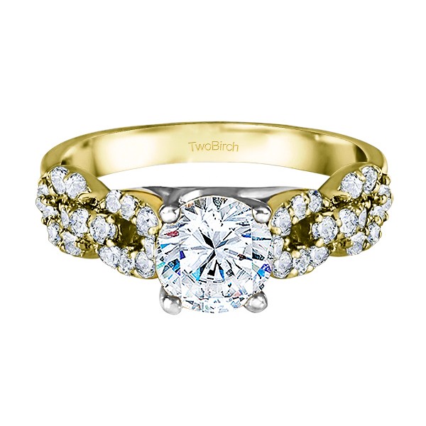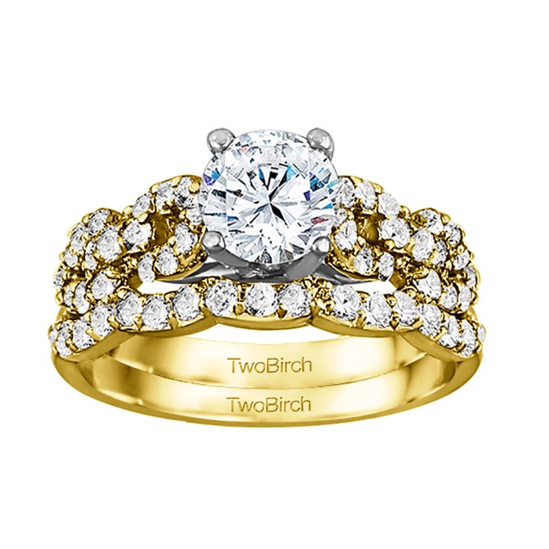 This TwoBirch bridal set features two rings: an engagement ring and matching wedding band. Every bridal set we sell is made with conflict free and eco-conscious metals and stones. This engagement ring features a Round center stone, surrounded by 34 side stones. The engagement ring has a 1 carat center stone, and 0.51 carats of side stones, giving the engagement ring a total weight of 1.51 carats. The matching wedding band in this set has 17 stones with a total weight of 0.26 carats. This bridal set has a total combined weight of 1.77 carats. If you would like to purchase just the engagement ring in this set, please search for TB-ENG-262-H8L in the search bar above. This set is available in many variations of gold, as well as moissanite, diamonds, or even as a mounting with no center stone. Please make selections from the drop down menus.