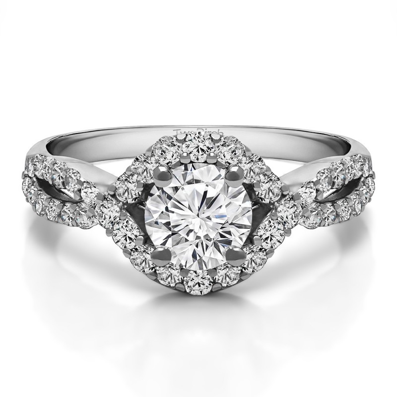 This TwoBirch bridal set features two rings: an engagement ring and matching wedding band. Every bridal set we sell is made with conflict free and eco-conscious metals and stones. This engagement ring features a Round center stone, surrounded by 38 side stones. The engagement ring has a 0.8 carat center stone, and 0.72 carats of side stones, giving the engagement ring a total weight of 1.52 carats. The matching wedding band in this set has 15 stones with a total weight of 0.3 carats. This bridal set has a total combined weight of 1.82 carats. If you would like to purchase just the engagement ring in this set, please search for TB-ENG-258-J71K in the search bar above. This set is available in many variations of gold, as well as moissanite, diamonds, or even as a mounting with no center stone. Please make selections from the drop down menus.