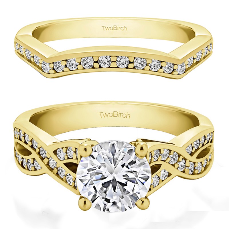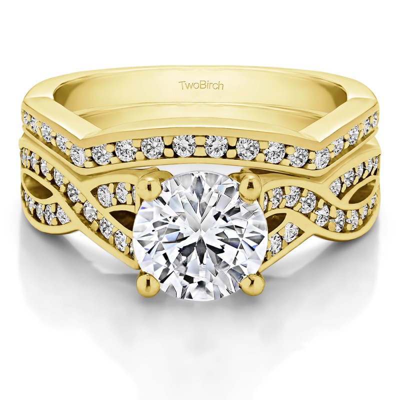This TwoBirch bridal set features two rings: an engagement ring and matching wedding band. Every bridal set we sell is made with conflict free and eco-conscious metals and stones. This engagement ring features a Round center stone, surrounded by 44 side stones. The engagement ring has a 1.5 carat center stone, and 0.42 carats of side stones, giving the engagement ring a total weight of 1.92 carats. The matching wedding band in this set has 22 stones with a total weight of 0.22 carats. This bridal set has a total combined weight of 2.14 carats. If you would like to purchase just the engagement ring in this set, please search for TB-ENG-309-GN in the search bar above. This set is available in many variations of gold, as well as moissanite, diamonds, or even as a mounting with no center stone. Please make selections from the drop down menus.
