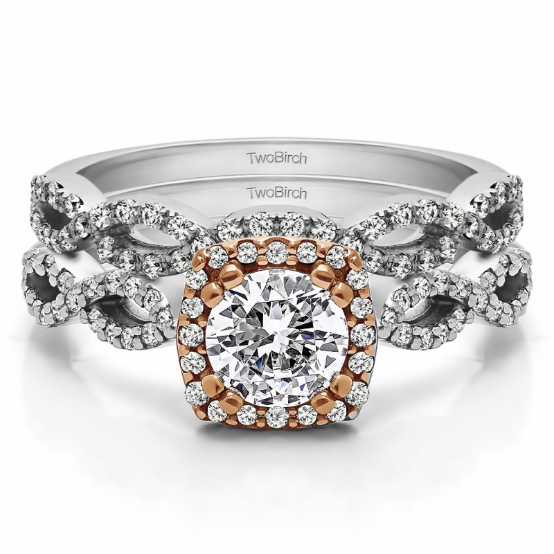 This TwoBirch bridal set features two rings: an engagement ring and matching wedding band. Every bridal set we sell is made with conflict free and eco-conscious metals and stones. This engagement ring features a Round center stone, surrounded by 58 side stones. The engagement ring has a 0.75 carat center stone, and 0.25 carats of side stones, giving the engagement ring a total weight of 1 carats. The matching wedding band in this set has 46 stones with a total weight of 0.18 carats. This bridal set has a total combined weight of 1.18 carats. If you would like to purchase just the engagement ring in this set, please search for TB-ENG-226-E7J in the search bar above. This set is available in many variations of gold, as well as moissanite, diamonds, or even as a mounting with no center stone. Please make selections from the drop down menus.