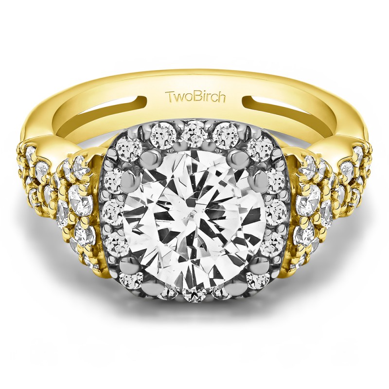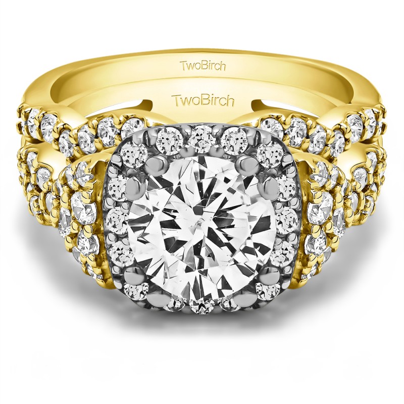 This TwoBirch bridal set features two rings: an engagement ring and matching wedding band. Every bridal set we sell is made with conflict free and eco-conscious metals and stones. This engagement ring features a Round center stone, surrounded by 50 side stones. The engagement ring has a 1.5 carat center stone, and 1 carats of side stones, giving the engagement ring a total weight of 2.5 carats. The matching wedding band in this set has 18 stones with a total weight of 0.27 carats. This bridal set has a total combined weight of 2.77 carats. If you would like to purchase just the engagement ring in this set, please search for TB-ENG-269-LN in the search bar above. This set is available in many variations of gold, as well as moissanite, diamonds, or even as a mounting with no center stone. Please make selections from the drop down menus.