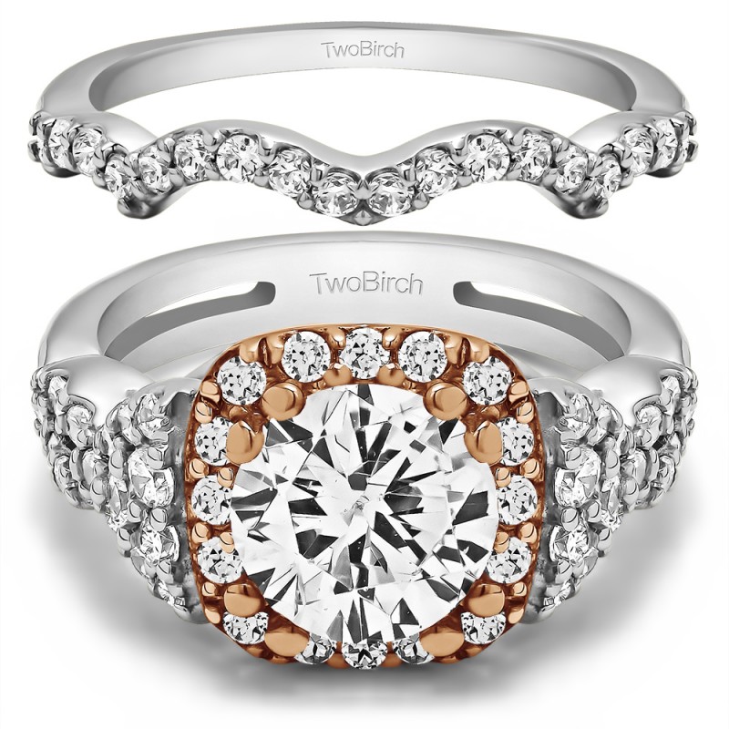 This TwoBirch bridal set features two rings: an engagement ring and matching wedding band. Every bridal set we sell is made with conflict free and eco-conscious metals and stones. This engagement ring features a Round center stone, surrounded by 50 side stones. The engagement ring has a 1.5 carat center stone, and 1 carats of side stones, giving the engagement ring a total weight of 2.5 carats. The matching wedding band in this set has 18 stones with a total weight of 0.27 carats. This bridal set has a total combined weight of 2.77 carats. If you would like to purchase just the engagement ring in this set, please search for TB-ENG-269-LN in the search bar above. This set is available in many variations of gold, as well as moissanite, diamonds, or even as a mounting with no center stone. Please make selections from the drop down menus.