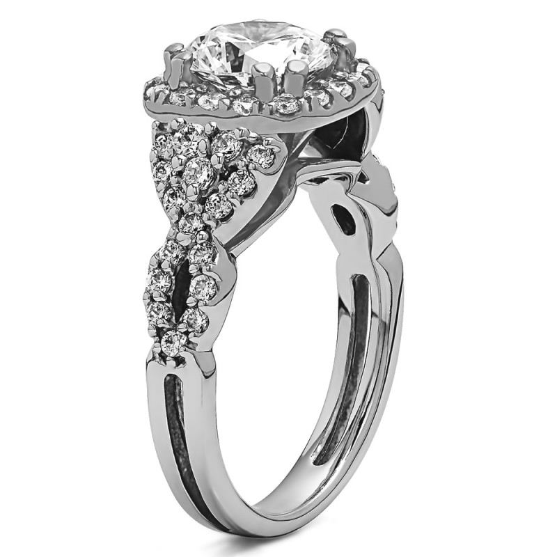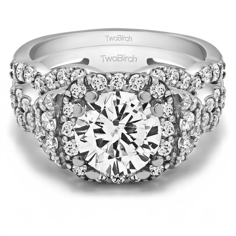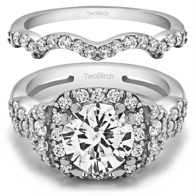 This TwoBirch bridal set features two rings: an engagement ring and matching wedding band. Every bridal set we sell is made with conflict free and eco-conscious metals and stones. This engagement ring features a Round center stone, surrounded by 50 side stones. The engagement ring has a 1.5 carat center stone, and 1 carats of side stones, giving the engagement ring a total weight of 2.5 carats. The matching wedding band in this set has 18 stones with a total weight of 0.27 carats. This bridal set has a total combined weight of 2.77 carats. If you would like to purchase just the engagement ring in this set, please search for TB-ENG-269-LN in the search bar above. This set is available in many variations of gold, as well as moissanite, diamonds, or even as a mounting with no center stone. Please make selections from the drop down menus.