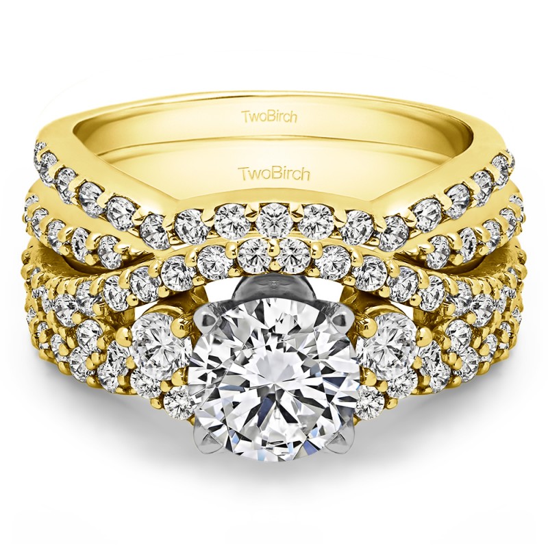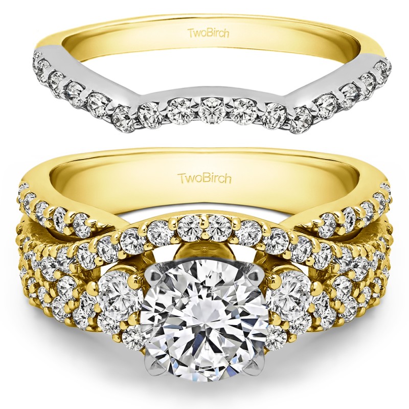 This TwoBirch bridal set features two rings: an engagement ring and matching wedding band. Every bridal set we sell is made with conflict free and eco-conscious metals and stones. This engagement ring features a Round center stone, surrounded by 54 side stones. The engagement ring has a 1.5 carat center stone, and 1.15 carats of side stones, giving the engagement ring a total weight of 2.65 carats. The matching wedding band in this set has 17 stones with a total weight of 0.3 carats. This bridal set has a total combined weight of 2.95 carats. If you would like to purchase just the engagement ring in this set, please search for TB-ENG-239-M85N in the search bar above. This set is available in many variations of gold, as well as moissanite, diamonds, or even as a mounting with no center stone. Please make selections from the drop down menus.