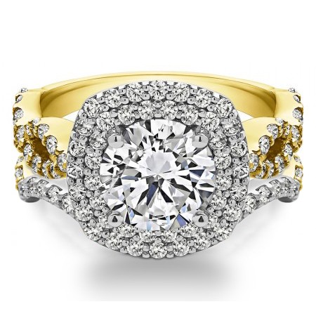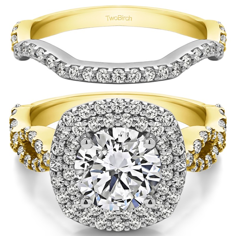 This TwoBirch bridal set features two rings: an engagement ring and matching wedding band. Every bridal set we sell is made with conflict free and eco-conscious metals and stones. This engagement ring features a Round center stone, surrounded by 82 side stones. The engagement ring has a 2 carat center stone, and 0.82 carats of side stones, giving the engagement ring a total weight of 2.82 carats. The matching wedding band in this set has 31 stones with a total weight of 0.31 carats. This bridal set has a total combined weight of 3.13 carats. If you would like to purchase just the engagement ring in this set, please search for TB-ENG-261-KP in the search bar above. This set is available in many variations of gold, as well as moissanite, diamonds, or even as a mounting with no center stone. Please make selections from the drop down menus.
