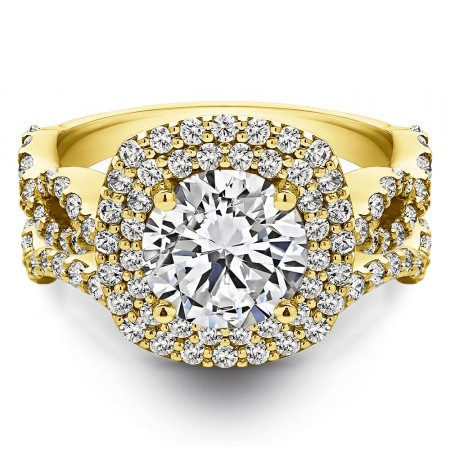 This TwoBirch bridal set features two rings: an engagement ring and matching wedding band. Every bridal set we sell is made with conflict free and eco-conscious metals and stones. This engagement ring features a Round center stone, surrounded by 82 side stones. The engagement ring has a 2 carat center stone, and 0.82 carats of side stones, giving the engagement ring a total weight of 2.82 carats. The matching wedding band in this set has 31 stones with a total weight of 0.31 carats. This bridal set has a total combined weight of 3.13 carats. If you would like to purchase just the engagement ring in this set, please search for TB-ENG-261-KP in the search bar above. This set is available in many variations of gold, as well as moissanite, diamonds, or even as a mounting with no center stone. Please make selections from the drop down menus.