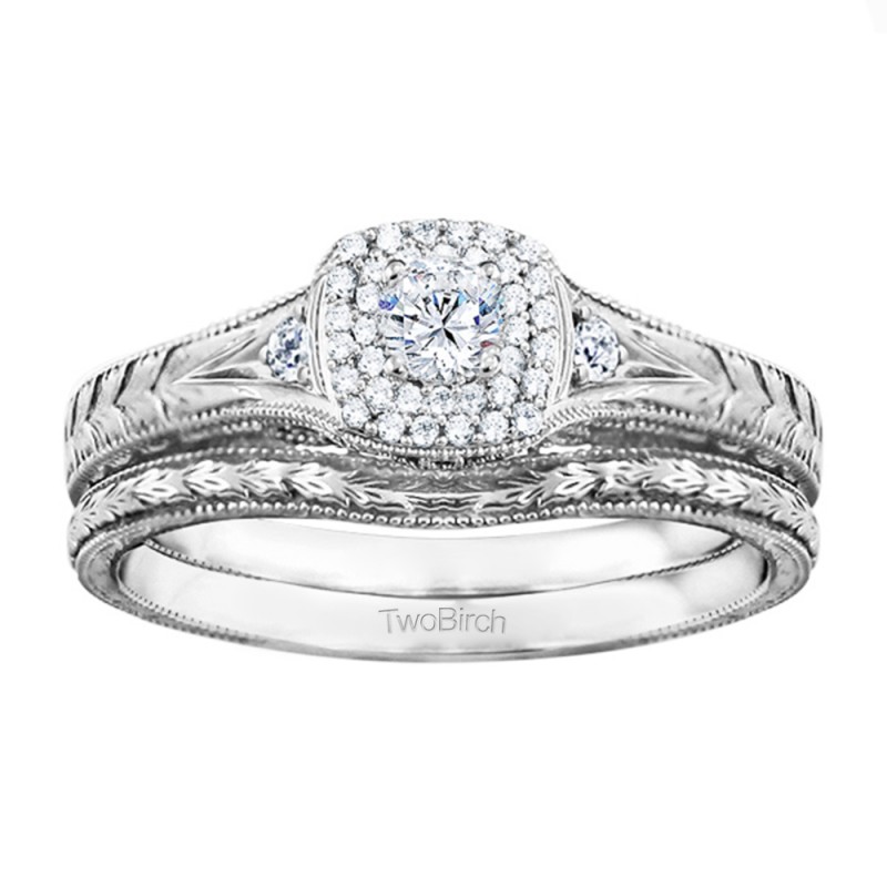 This TwoBirch bridal set features two rings: an engagement ring and matching wedding band. Every bridal set we sell is made with conflict free and eco-conscious metals and stones. This engagement ring features a Round center stone, surrounded by 38 side stones. The engagement ring has a 0.25 carat center stone, and 0.23 carats of side stones, giving the engagement ring a total weight of 0.48 carats. This bridal set features a wedding band with no stones. If you would like to purchase just the engagement ring in this set, please search for TB-ENG-242-E2E in the search bar above. This set is available in many variations of gold, as well as moissanite, diamonds, or even as a mounting with no center stone. Please make selections from the drop down menus.