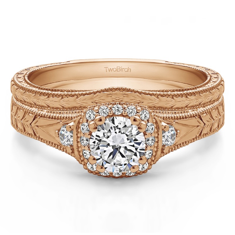 This TwoBirch bridal set features two rings: an engagement ring and matching wedding band. Every bridal set we sell is made with conflict free and eco-conscious metals and stones. This engagement ring features a Round center stone, surrounded by 18 side stones. The engagement ring has a 0.5 carat center stone, and 0.15 carats of side stones, giving the engagement ring a total weight of 0.65 carats. This bridal set features a wedding band with no stones. If you would like to purchase just the engagement ring in this set, please search for TB-ENG-243-C5H in the search bar above. This set is available in many variations of gold, as well as moissanite, diamonds, or even as a mounting with no center stone. Please make selections from the drop down menus.
