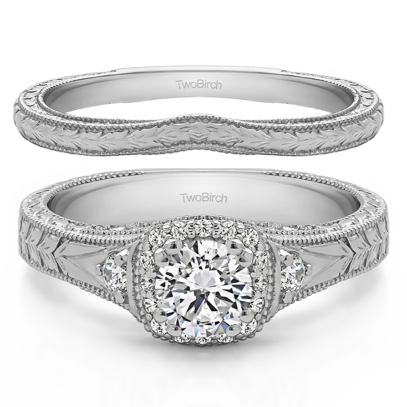 This TwoBirch bridal set features two rings: an engagement ring and matching wedding band. Every bridal set we sell is made with conflict free and eco-conscious metals and stones. This engagement ring features a Round center stone, surrounded by 18 side stones. The engagement ring has a 0.5 carat center stone, and 0.15 carats of side stones, giving the engagement ring a total weight of 0.65 carats. This bridal set features a wedding band with no stones. If you would like to purchase just the engagement ring in this set, please search for TB-ENG-243-C5H in the search bar above. This set is available in many variations of gold, as well as moissanite, diamonds, or even as a mounting with no center stone. Please make selections from the drop down menus.