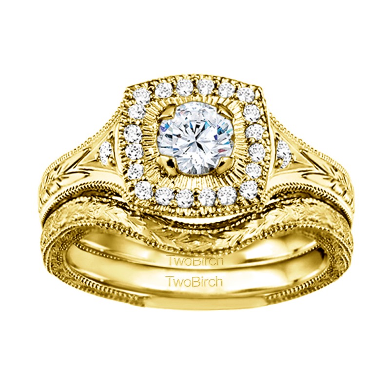 This TwoBirch bridal set features two rings: an engagement ring and matching wedding band. Every bridal set we sell is made with conflict free and eco-conscious metals and stones. This engagement ring features a Round center stone, surrounded by 22 side stones. The engagement ring has a 0.5 carat center stone, and 0.24 carats of side stones, giving the engagement ring a total weight of 0.74 carats. This bridal set features a wedding band with no stones. If you would like to purchase just the engagement ring in this set, please search for TB-ENG-223-E5H in the search bar above. This set is available in many variations of gold, as well as moissanite, diamonds, or even as a mounting with no center stone. Please make selections from the drop down menus.