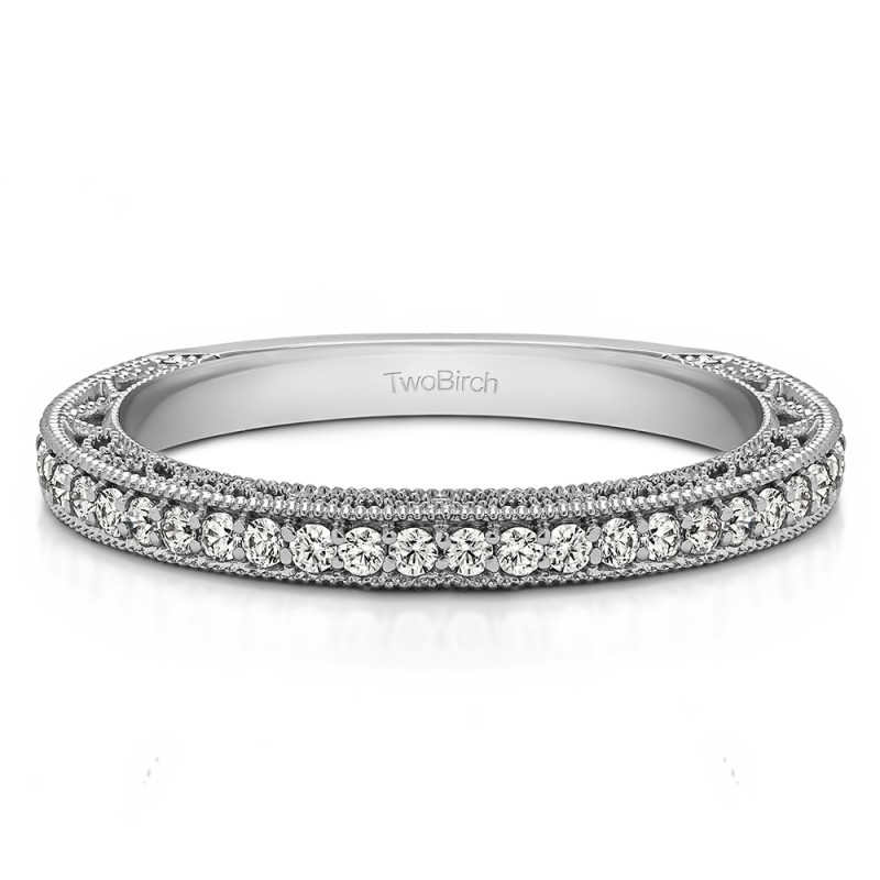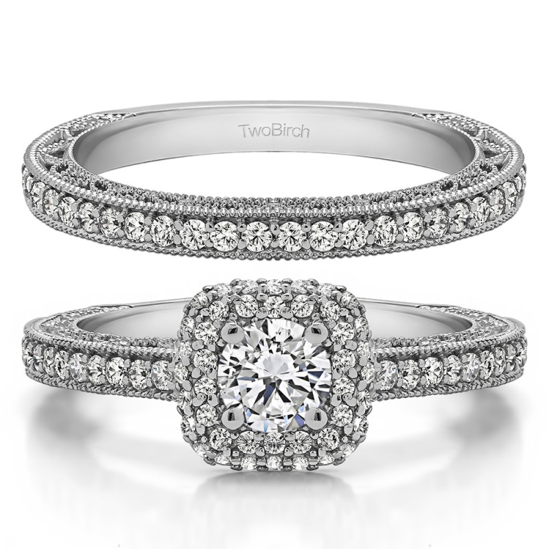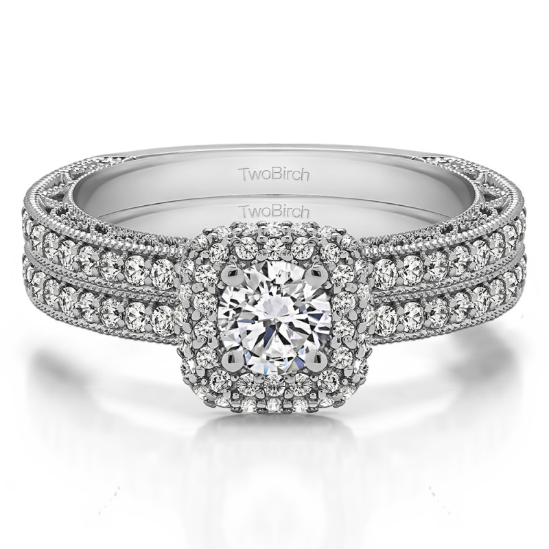This TwoBirch bridal set features two rings: an engagement ring and matching wedding band. Every bridal set we sell is made with conflict free and eco-conscious metals and stones. This engagement ring features a Round center stone, surrounded by 72 side stones. The engagement ring has a 0.5 carat center stone, and 0.51 carats of side stones, giving the engagement ring a total weight of 1.01 carats. The matching wedding band in this set has 33 stones with a total weight of 0.33 carats. This bridal set has a total combined weight of 1.34 carats. If you would like to purchase just the engagement ring in this set, please search for TB-ENG-241-H5H in the search bar above. This set is available in many variations of gold, as well as moissanite, diamonds, or even as a mounting with no center stone. Please make selections from the drop down menus.