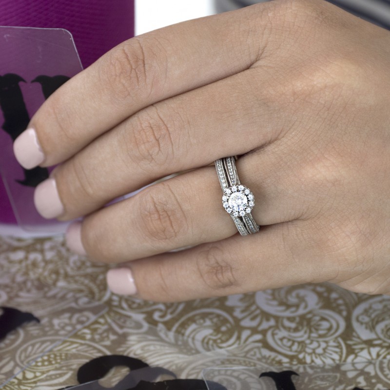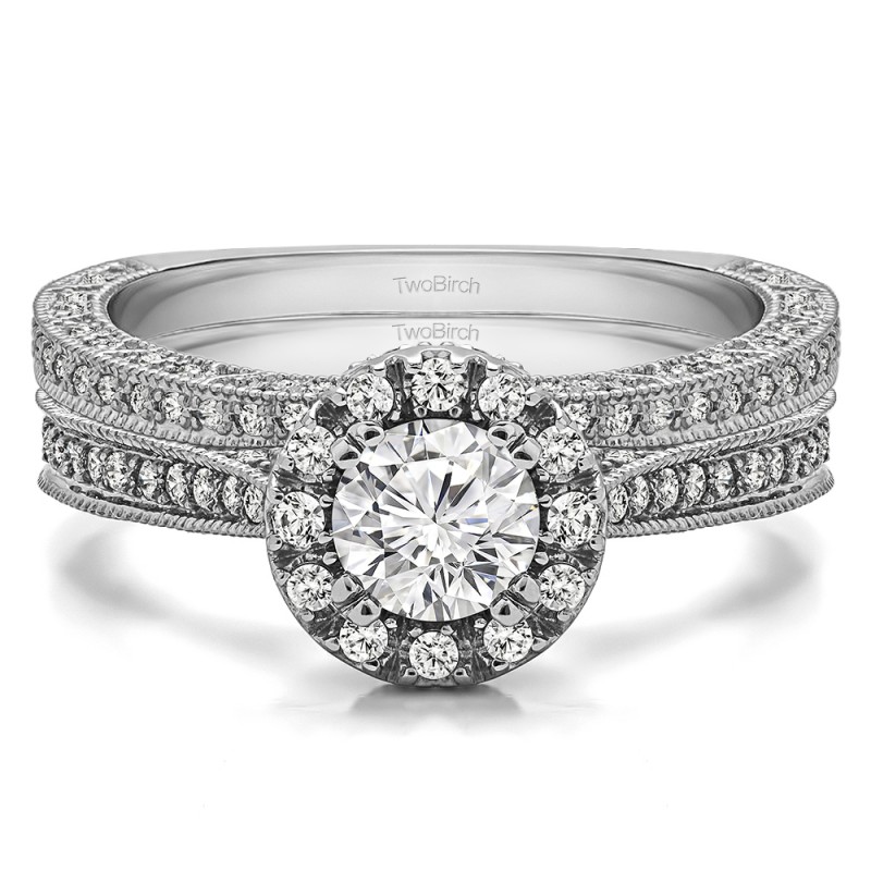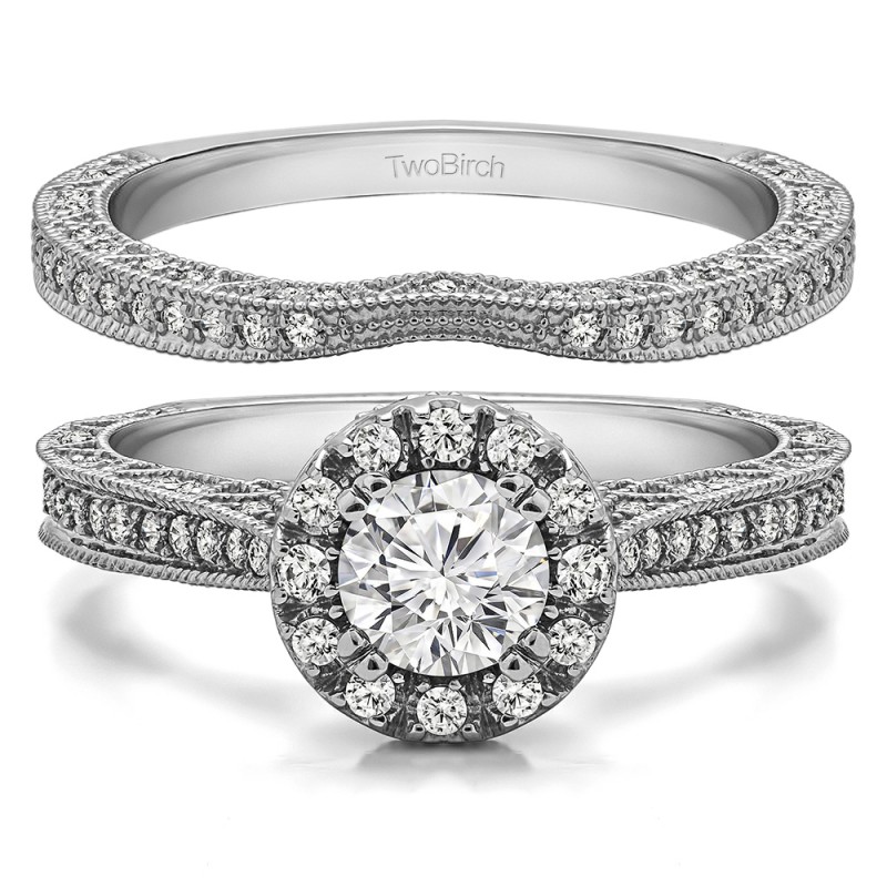 This TwoBirch bridal set features two rings: an engagement ring and matching wedding band. Every bridal set we sell is made with conflict free and eco-conscious metals and stones. This engagement ring features a Round center stone, surrounded by 96 side stones. The engagement ring has a 0.5 carat center stone, and 0.52 carats of side stones, giving the engagement ring a total weight of 1.02 carats. The matching wedding band in this set has 74 stones with a total weight of 0.3 carats. This bridal set has a total combined weight of 1.32 carats. If you would like to purchase just the engagement ring in this set, please search for TB-ENG-213-H5H in the search bar above. This set is available in many variations of gold, as well as moissanite, diamonds, or even as a mounting with no center stone. Please make selections from the drop down menus.