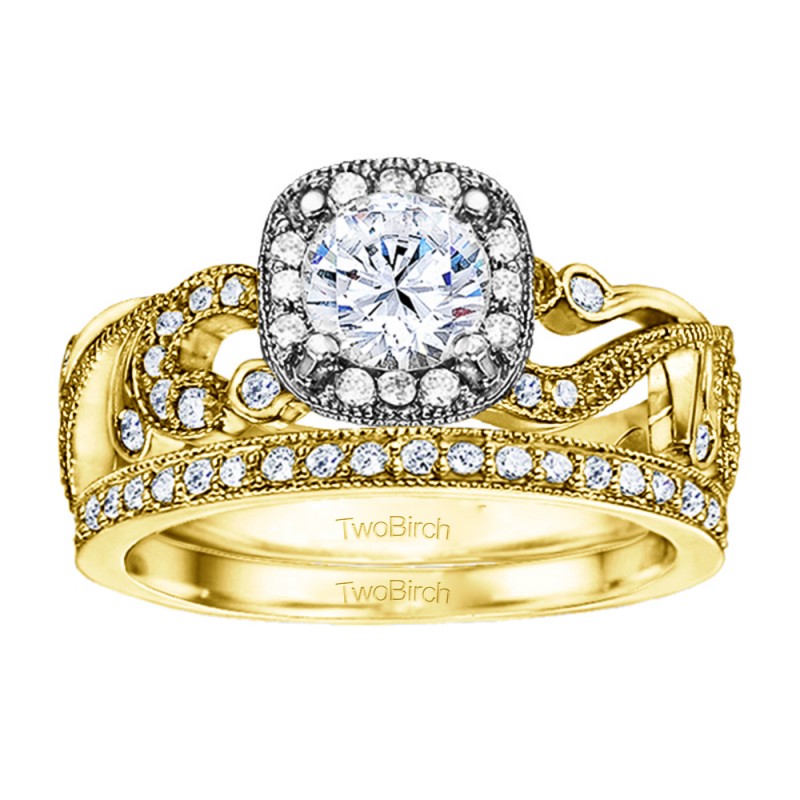 This TwoBirch bridal set features two rings: an engagement ring and matching wedding band. Every bridal set we sell is made with conflict free and eco-conscious metals and stones. This engagement ring features a Round center stone, surrounded by 56 side stones. The engagement ring has a 0.75 carat center stone, and 0.39 carats of side stones, giving the engagement ring a total weight of 1.14 carats. The matching wedding band in this set has 25 stones with a total weight of 0.19 carats. This bridal set has a total combined weight of 1.33 carats. If you would like to purchase just the engagement ring in this set, please search for TB-ENG-240-F7J in the search bar above. This set is available in many variations of gold, as well as moissanite, diamonds, or even as a mounting with no center stone. Please make selections from the drop down menus.