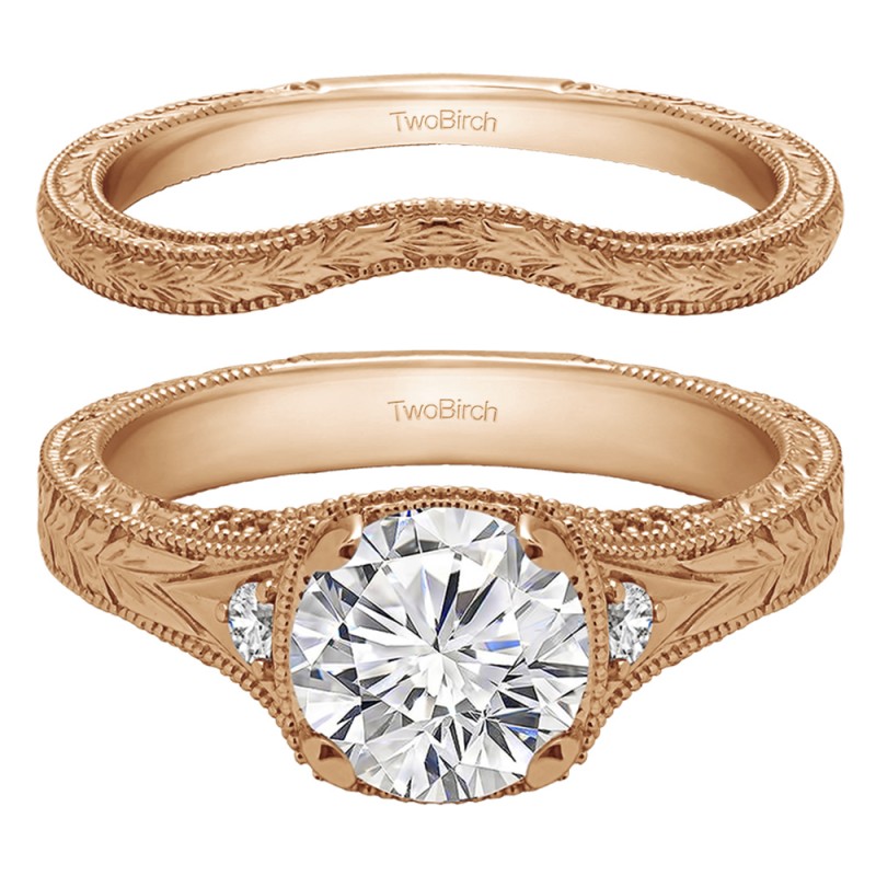 This TwoBirch bridal set features two rings: an engagement ring and matching wedding band. Every bridal set we sell is made with conflict free and eco-conscious metals and stones. This engagement ring features a Round center stone, surrounded by 2 side stones. The engagement ring has a 1.25 carat center stone, and 0.06 carats of side stones, giving the engagement ring a total weight of 1.31 carats. This bridal set features a wedding band with no stones. If you would like to purchase just the engagement ring in this set, please search for TB-ENG-347-A82M in the search bar above. This set is available in many variations of gold, as well as moissanite, diamonds, or even as a mounting with no center stone. Please make selections from the drop down menus.