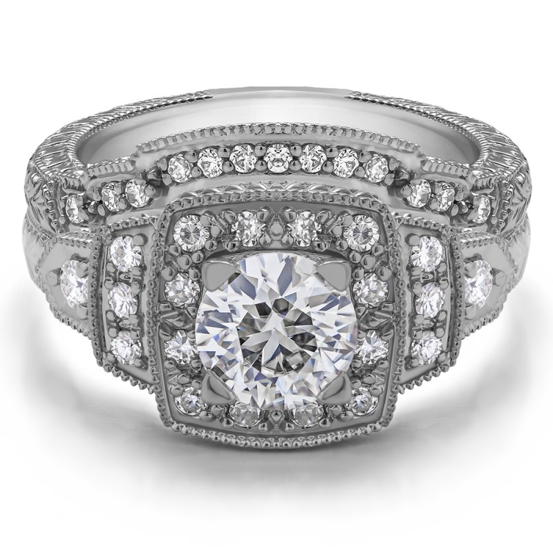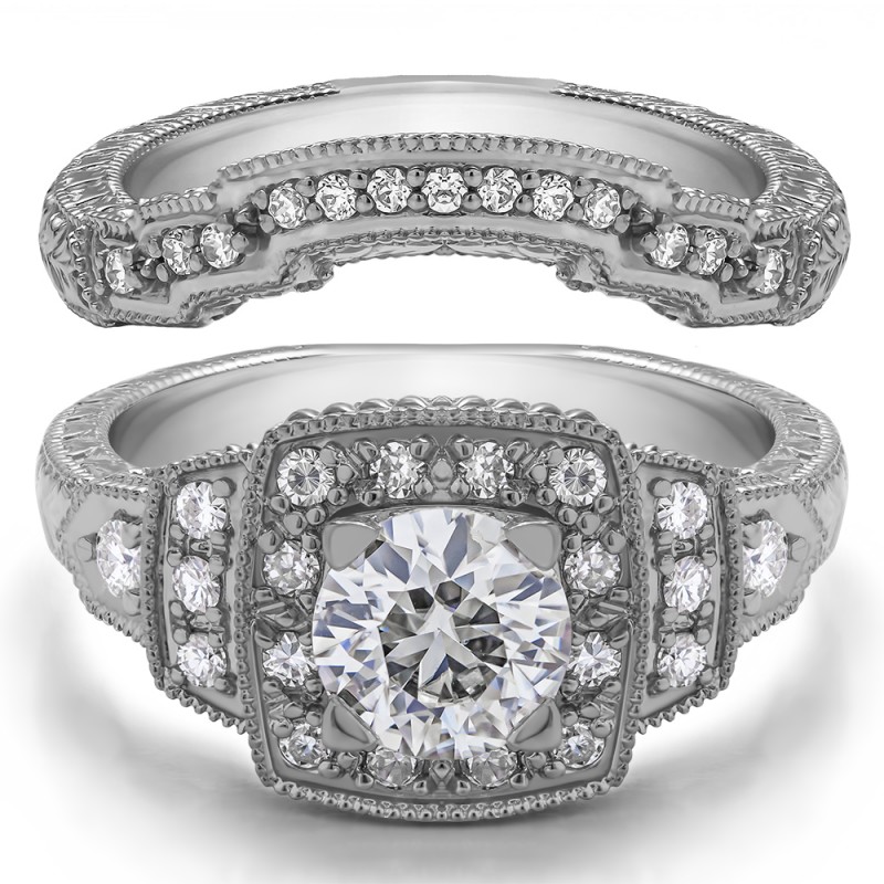 This TwoBirch bridal set features two rings: an engagement ring and matching wedding band. Every bridal set we sell is made with conflict free and eco-conscious metals and stones. This engagement ring features a Round center stone, surrounded by 20 side stones. The engagement ring has a 1 carat center stone, and 0.35 carats of side stones, giving the engagement ring a total weight of 1.35 carats. The matching wedding band in this set has 13 stones with a total weight of 0.1 carats. This bridal set has a total combined weight of 1.45 carats. If you would like to purchase just the engagement ring in this set, please search for TB-ENG-218-F8L in the search bar above. This set is available in many variations of gold, as well as moissanite, diamonds, or even as a mounting with no center stone. Please make selections from the drop down menus.