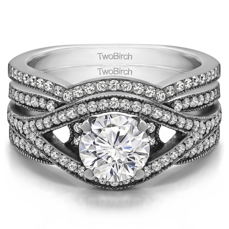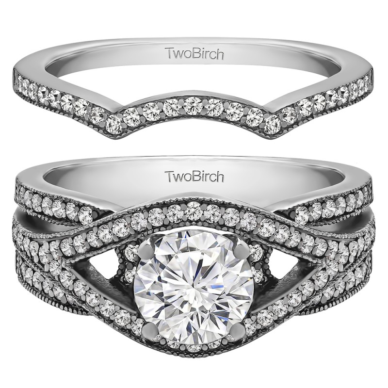 This TwoBirch bridal set features two rings: an engagement ring and matching wedding band. Every bridal set we sell is made with conflict free and eco-conscious metals and stones. This engagement ring features a Round center stone, surrounded by 82 side stones. The engagement ring has a 1 carat center stone, and 0.42 carats of side stones, giving the engagement ring a total weight of 1.42 carats. The matching wedding band in this set has 26 stones with a total weight of 0.13 carats. This bridal set has a total combined weight of 1.55 carats. If you would like to purchase just the engagement ring in this set, please search for TB-ENG-234-GL in the search bar above. This set is available in many variations of gold, as well as moissanite, diamonds, or even as a mounting with no center stone. Please make selections from the drop down menus.